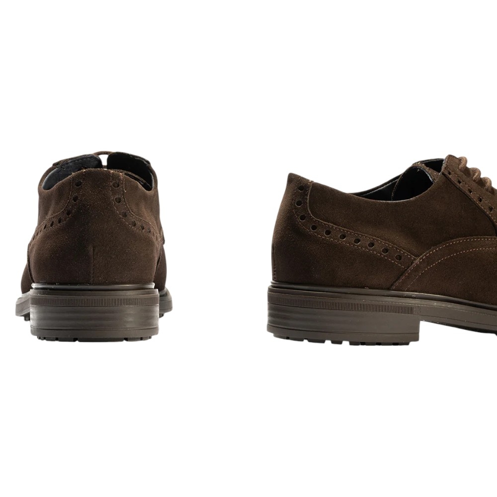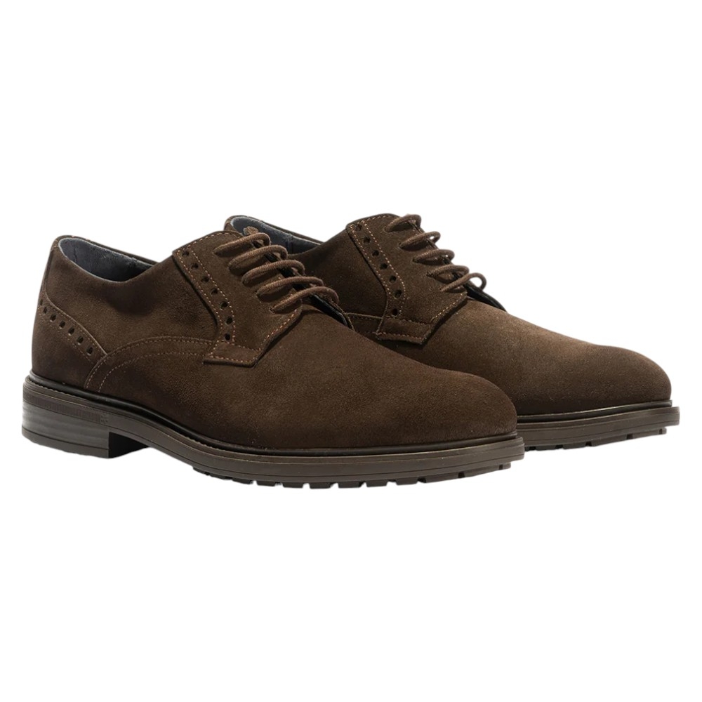 Este zapato destaca por su confección en suave Piel serraje, que le proporciona una textura sofisticada y un aspecto casual-elegante. El diseño es un clásico Blucher con cierre de cordones a tono. Incorpora detalles de perforaciones sutiles en los laterales y el talón que realzan su acabado.