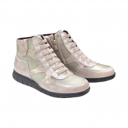 El modelo está confeccionado en un versátil color PIEDRA, que combina delicados tonos beige y champagne con sutiles acabados metalizados (oro viejo). Su diseño moderno presenta una atractiva composición patchwork que mezcla diferentes texturas, otorgándole un aire contemporáneo y una gran facilidad para combinar con múltiples prendas.