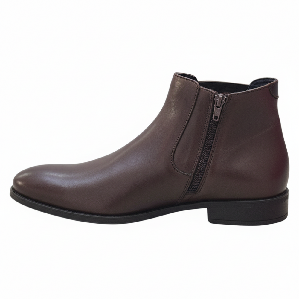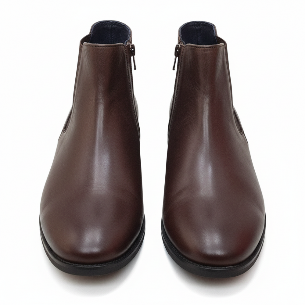 Estos botines presentan una silueta elegante y atemporal, ideal para complementar cualquier atuendo formal o smart casual. El exterior está elaborado con materiales de alta calidad, con un acabado liso y refinado en la puntera y un sutil detalle de textura en los laterales.