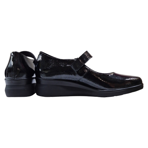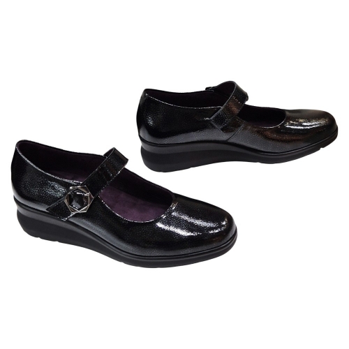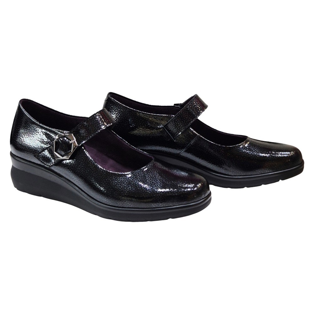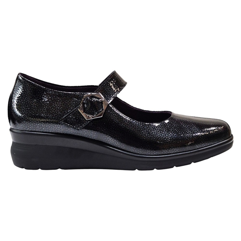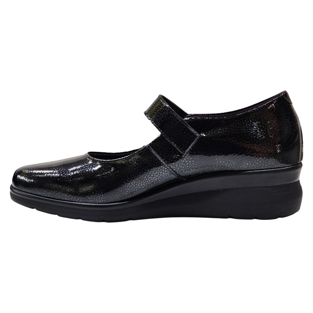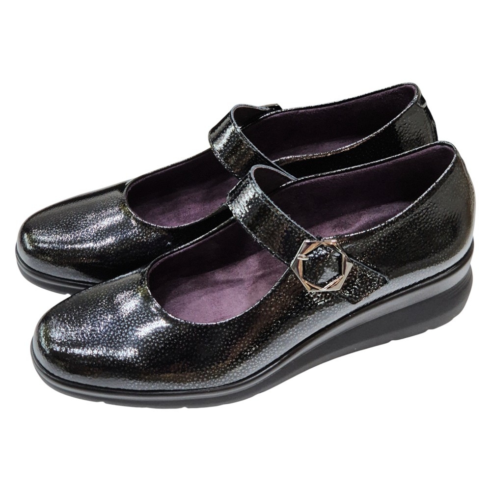 Estas merceditas están confeccionadas con Piel Charol Fantasía de primera calidad en un elegante color negro. El acabado acharolado no solo proporciona un brillo sutil y sofisticado, sino que también asegura una gran durabilidad y facilidad de mantenimiento. Su diseño clásico de mercedita se renueva con una sutil cuña que estiliza la figura.