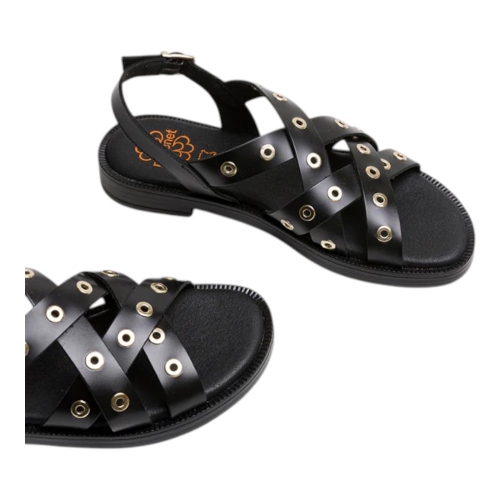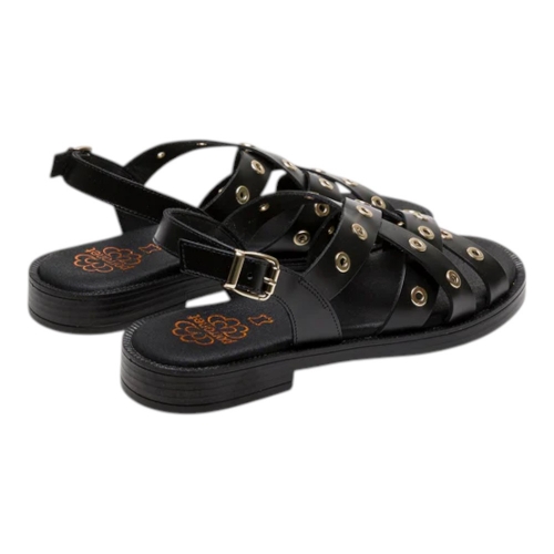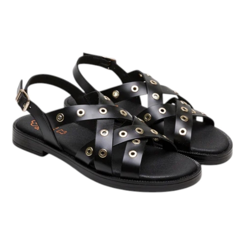 Su diseño presenta un cuerpo de tiras de piel entrecruzadas sobre el empeine, creando un efecto visual moderno y atractivo. Cada cruce de tira está adornado con ojales metálicos dorados, añadiendo un sutil toque de brillo y sofisticación al conjunto.