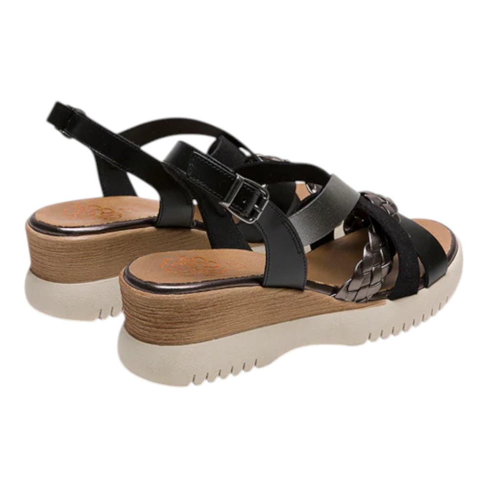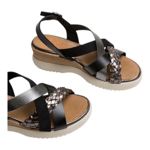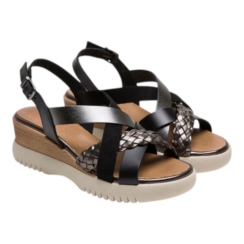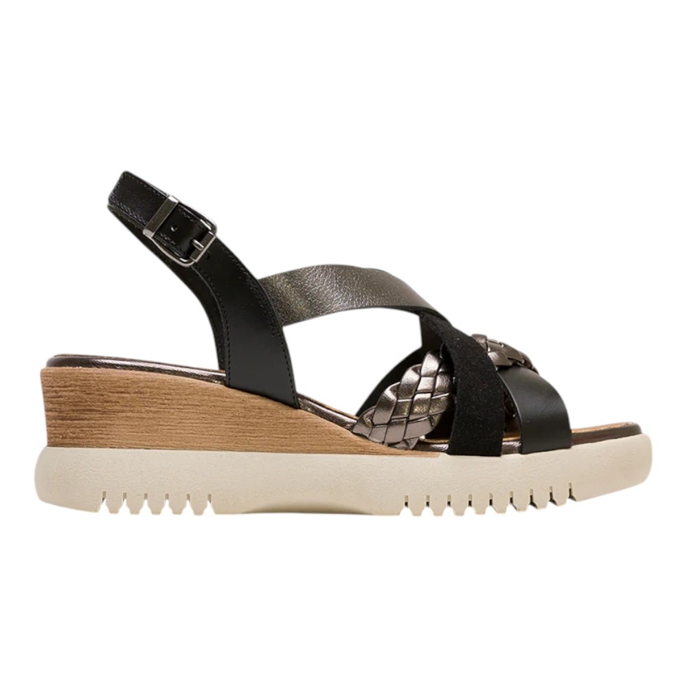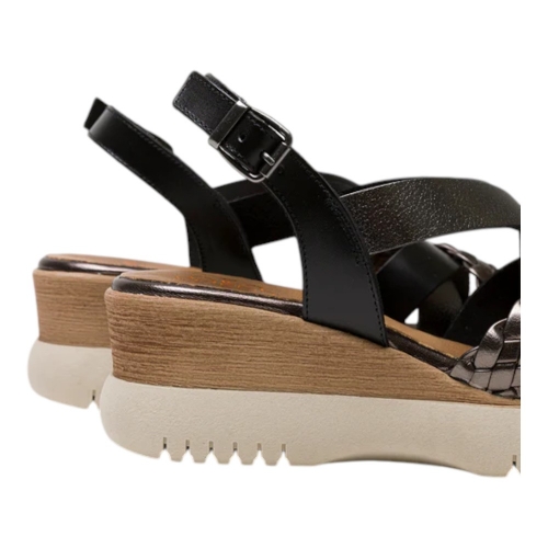 Sandalias de cuña de piel de tiras entrelazadas en diferentes tonos y detalle de trenza metalizada. Cierre con hebilla metálica lateral ajustable en el tobillo. Cuña de 5 cm de altura y plataforma delantera de 2 cm que combina acabados en varios materiales y tonalidades. Suela de poliuretano. Corte y plantilla acolchada de piel que garantiza una gran comodidad. Fabricadas artesanalmente 100% en España.