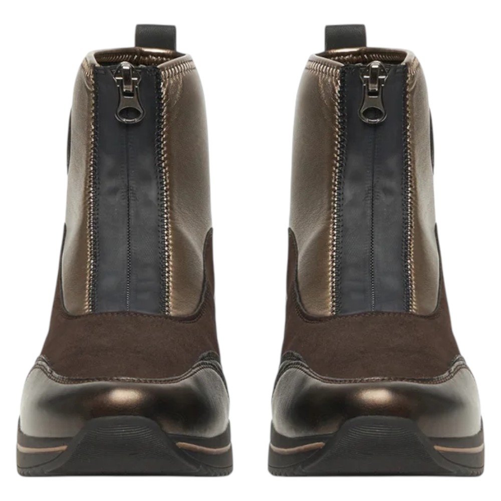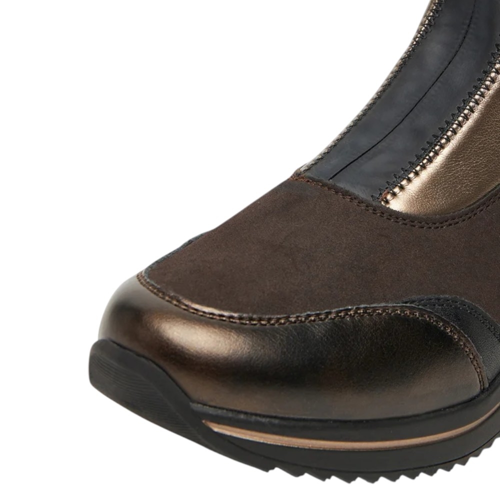 El calce es rápido y sencillo gracias a su práctico cierre de cremallera frontal, que no solo es funcional sino que también se integra como un elemento de diseño. La punta redonda proporciona un ajuste cómodo, mientras que la suela de cuña de estilo deportivo, con líneas onduladas en contraste, ofrece una pisada estable y un plus de altura.