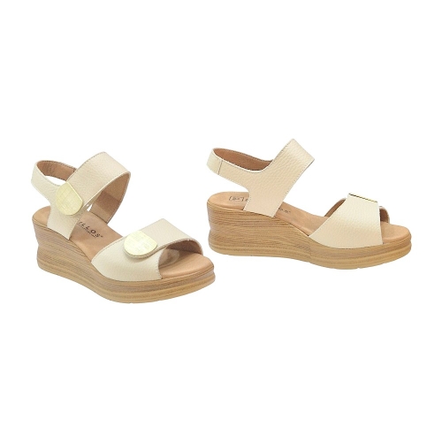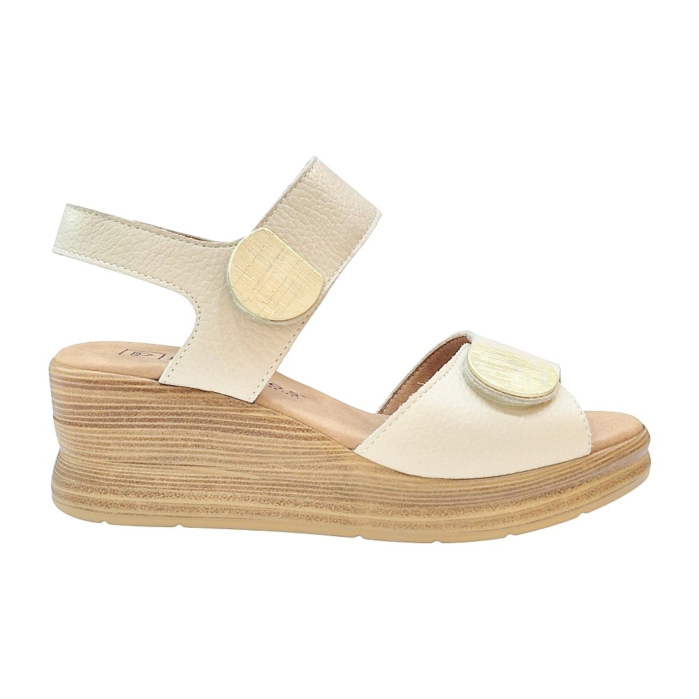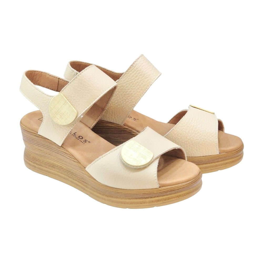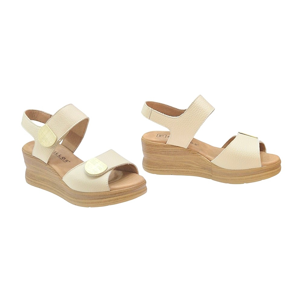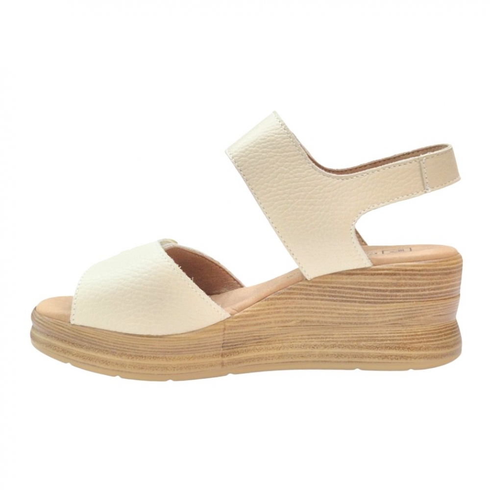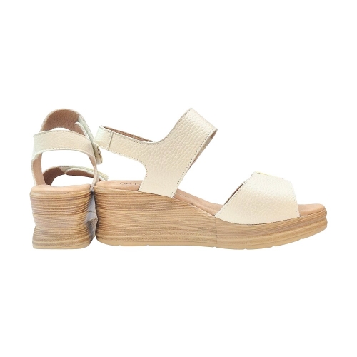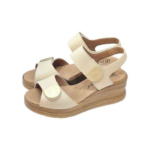 Fabricada íntegramente en España, esta sandalia destaca por su piel grabada de alta calidad en un suave tono crema. La textura del corte aporta un aire sofisticado, mientras que los detalles metálicos en acabado dorado cepillado actúan como un punto de luz que realza cualquier conjunto.