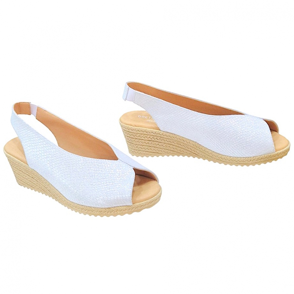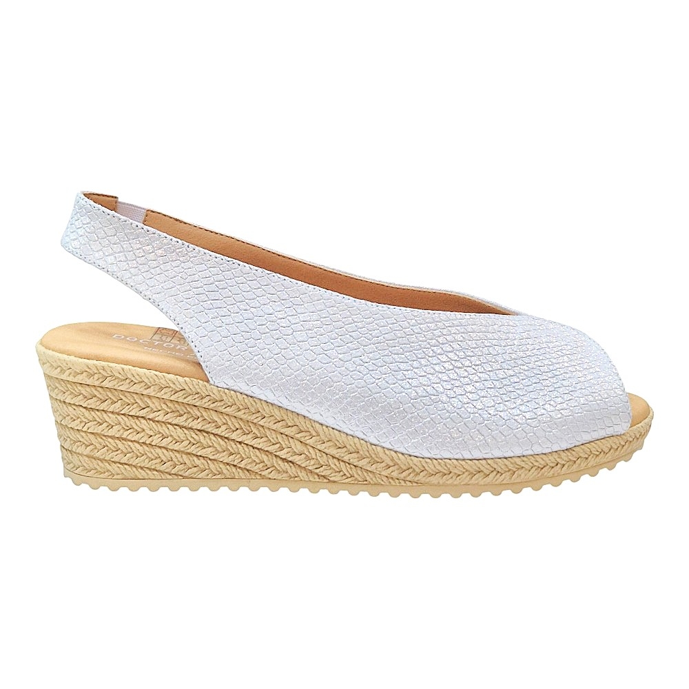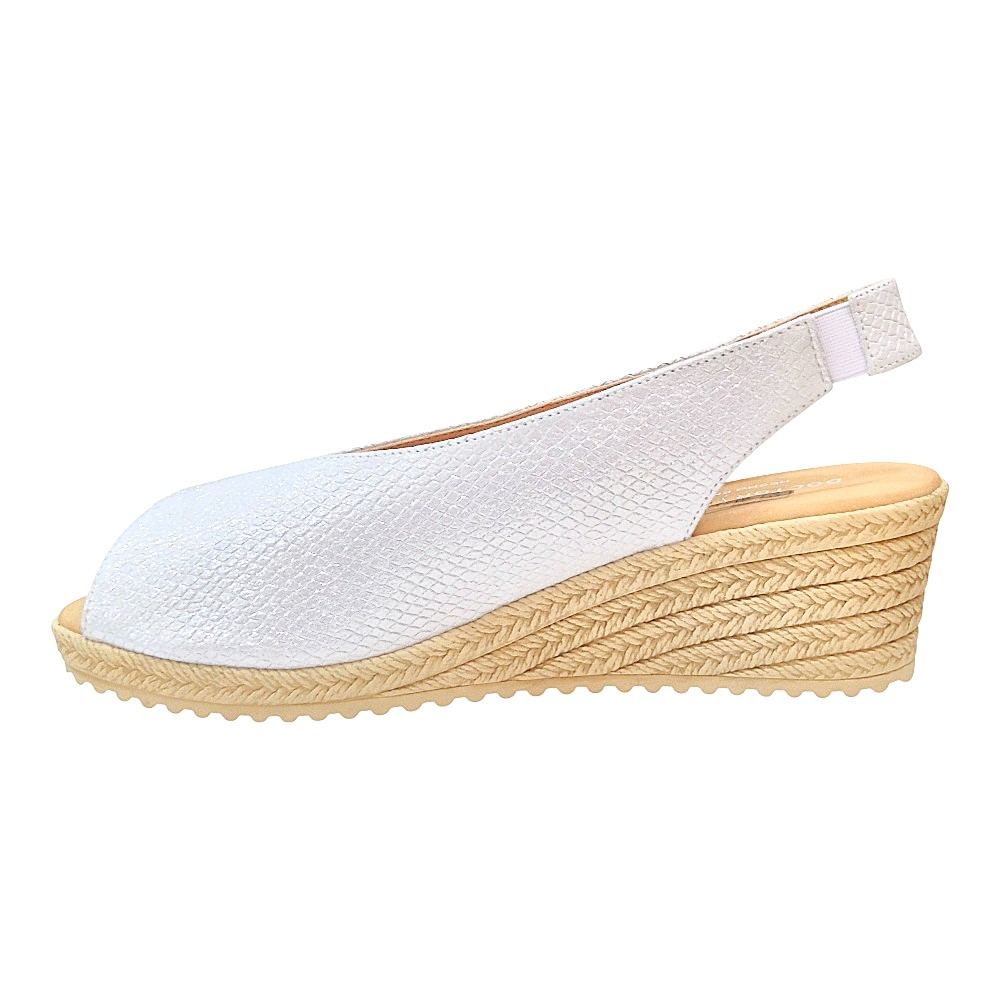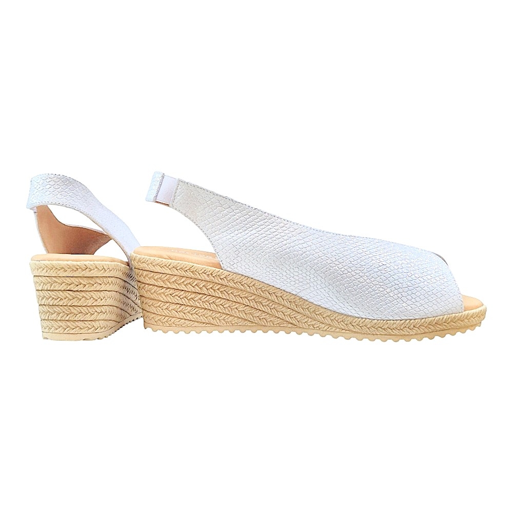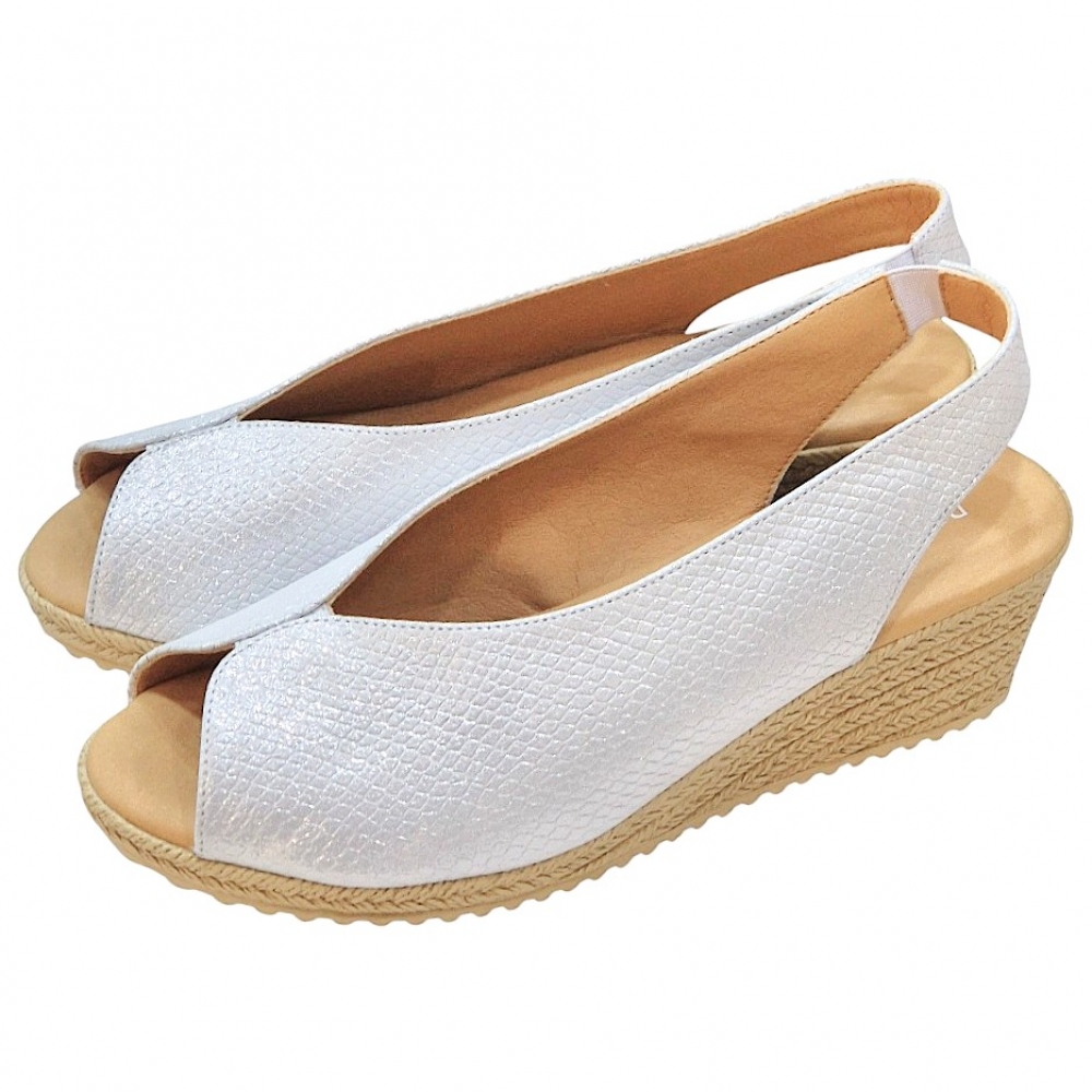 Este modelo destaca por su acabado en tonalidad clara con un sutil efecto irisado, que aporta luminosidad a cualquier conjunto veraniego. El corte exterior presenta un grabado con textura de serpiente que le confiere un aire moderno y distinguido. Su diseño de puntera abierta (peep-toe) y talón descubierto permite una ventilación óptima, ideal para los días más calurosos.