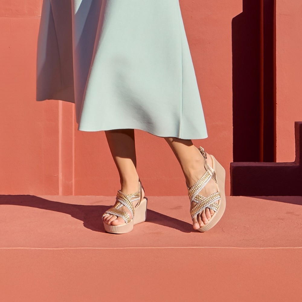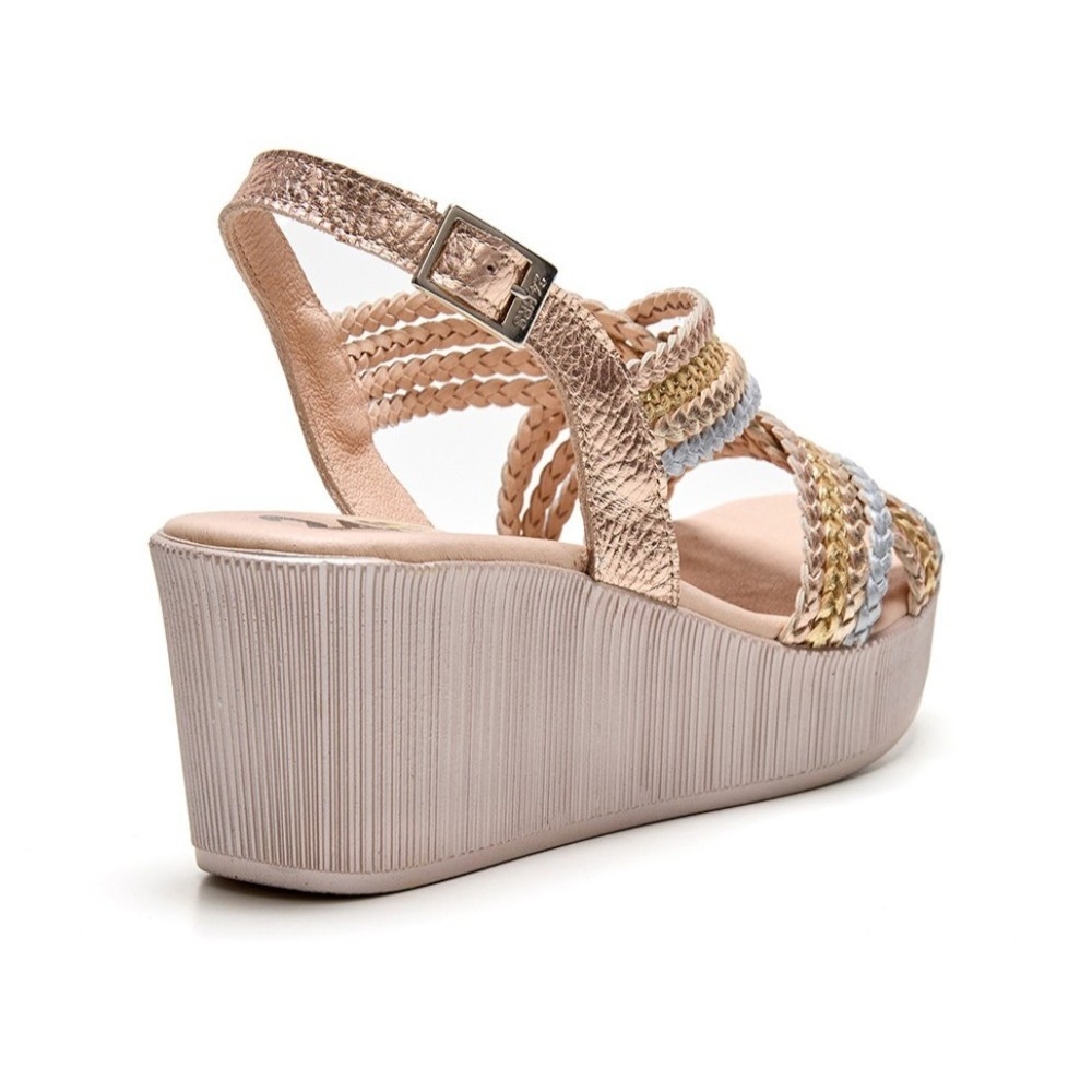 La joya de esta sandalia es su pala frontal, protagonizada por un exquisito entramado de tiras trenzadas en diferentes tonos metalizados (oro, plata y bronce). Este juego de texturas y reflejos no solo aporta un toque de lujo artesanal, sino que permite combinarla fácilmente con cualquier accesorio. Su cierre de hebilla lateral garantiza un ajuste seguro y personalizado a cada tobillo.