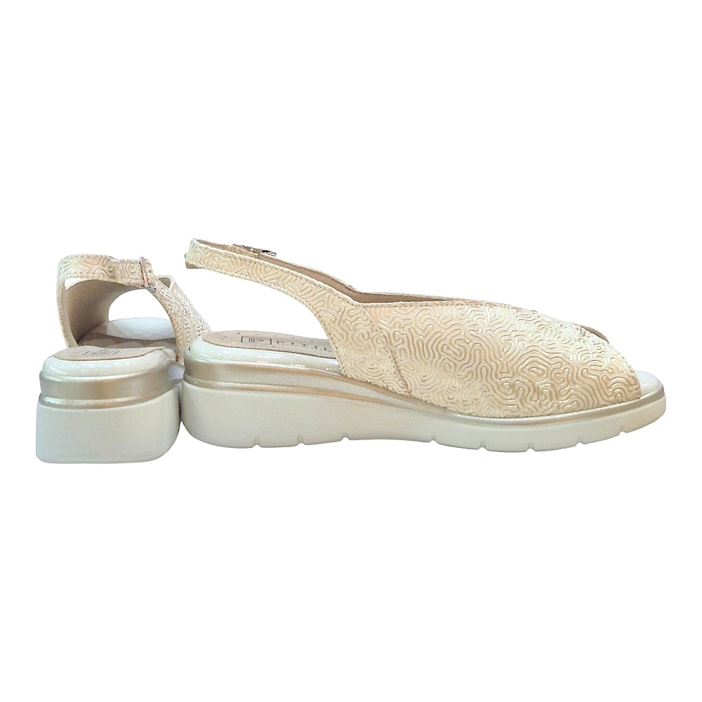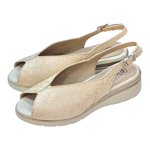 Este calzado está confeccionado en piel de primera calidad con un grabado ornamental en relieve que aporta una textura única y un brillo sutil en tono oro. Su diseño de pala cerrada con apertura delantera (peep-toe) estiliza el pie mientras ofrece una sujeción excepcional.