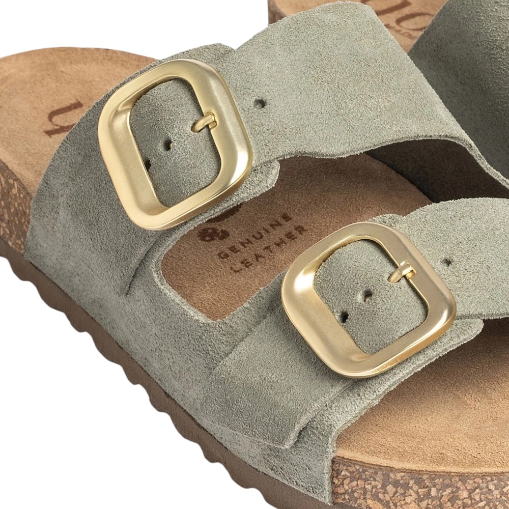 Sujeción Personalizada: Cuenta con dos tiras anchas equipadas con hebillas metálicas ajustables, permitiéndote adaptar el calce exactamente a la forma de tu pie.