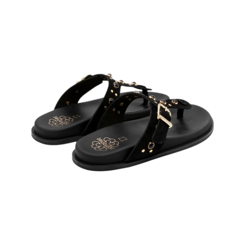 Confeccionada íntegramente en piel de vaquetilla de alta calidad, esta sandalia destaca por su acabado en color negro profundo y su silueta minimalista. Su diseño tipo esclava se ve enriquecido por: