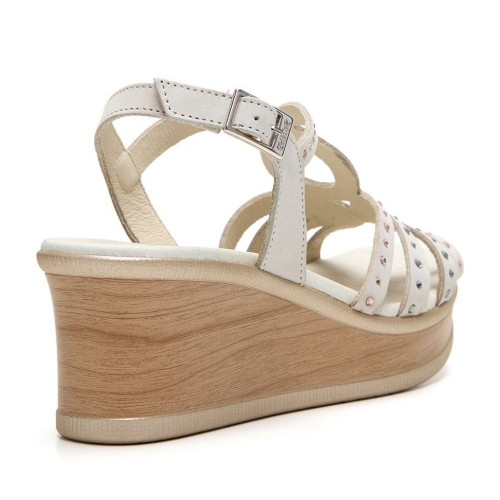 Esta sandalia está elaborada en piel nobuck de alta selección en un tono crema muy natural y favorecedor. Su estructura de tiras entrelazadas abraza el pie con delicadeza, destacando por sus elegantes detalles en pedrería que aportan destellos sutiles de luz a cada movimiento. El cierre mediante hebilla lateral asegura un ajuste firme y personalizado, adaptándose perfectamente a la anatomía del tobillo.