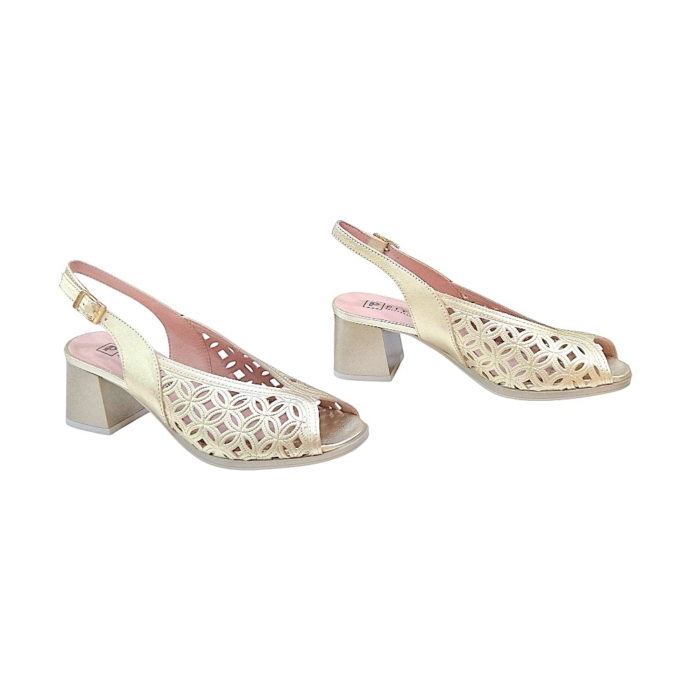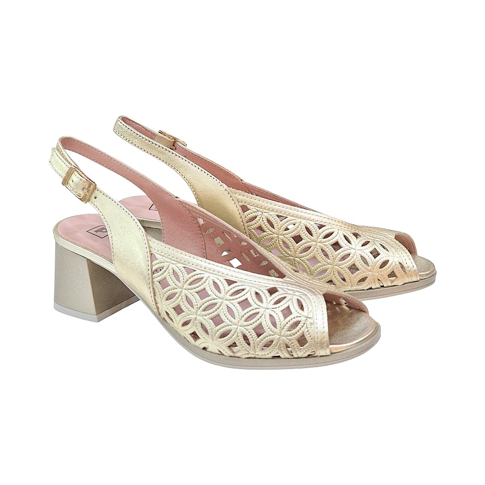 Este zapato presenta un diseño de pala calada con motivos geométricos que no solo aportan un aire artesanal y femenino, sino que también favorecen la transpirabilidad del pie. Su puntera abierta (peep-toe) y el talón descubierto le confieren una estética ligera y primaveral.