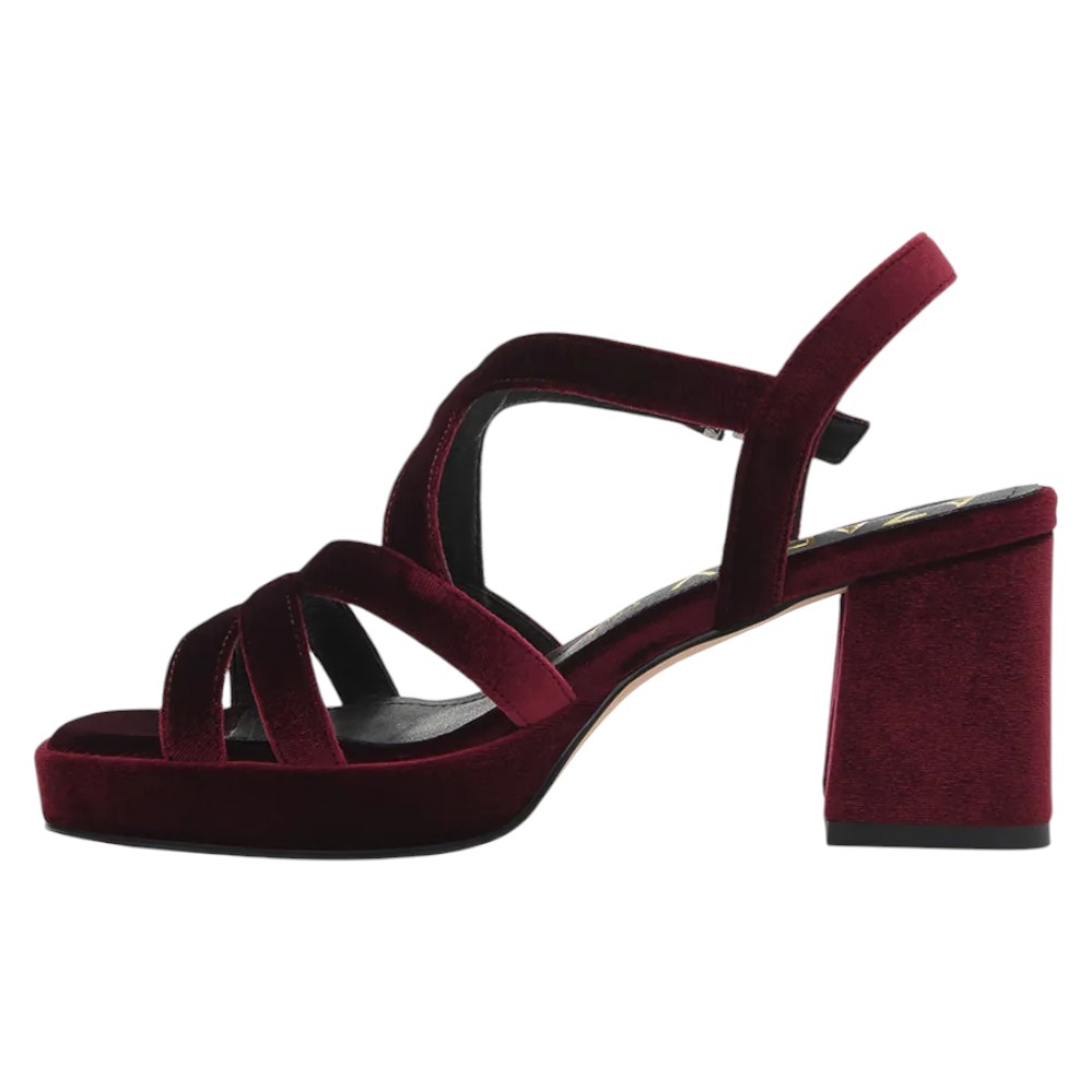 Añade un toque de sofisticación a tu estilo con estas sandalias de terciopelo Azarey en un impresionante tono burdeos. Con un tacón ancho y estable, estas sandalias ofrecen comodidad durante todo el día sin sacrificar el estilo. El elegante diseño de tiras cruzadas estiliza el pie, mientras que el cierre de hebilla ajustable en el tobillo garantiza una sujeción perfecta. Con un acabado aterciopelado de tacto suave, estas sandalias son el complemento ideal para tus looks más elegantes, desde eventos especiales hasta cenas de gala.