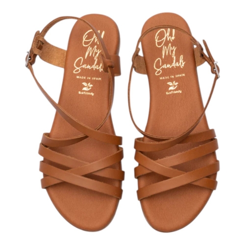 Sandalia plana de mujer fabricada en piel de color roble. Su diseño en tiras cruzadas y cierre ajustable en hebilla dará mayor sujeción y seguridad en cada pisada. El modelo Brenda es una de las mejores opciones para apostar por un look veraniego, refrescante y sobre todo, amigable con nuestros pies.