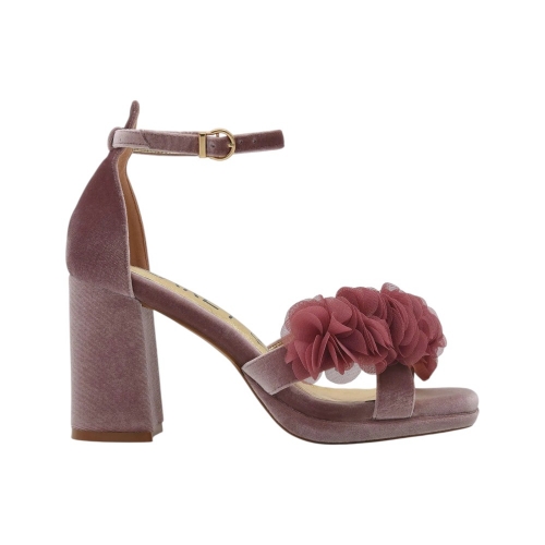 Estas sandalias destacan por su exquisito detalle de flores de gasa sobre la pala, que aporta un volumen delicado y un aire de alta costura. Su acabado en terciopelo beige ofrece un brillo sutil y una textura suave que armoniza con cualquier paleta de colores, desde tonos pasteles hasta colores vibrantes.