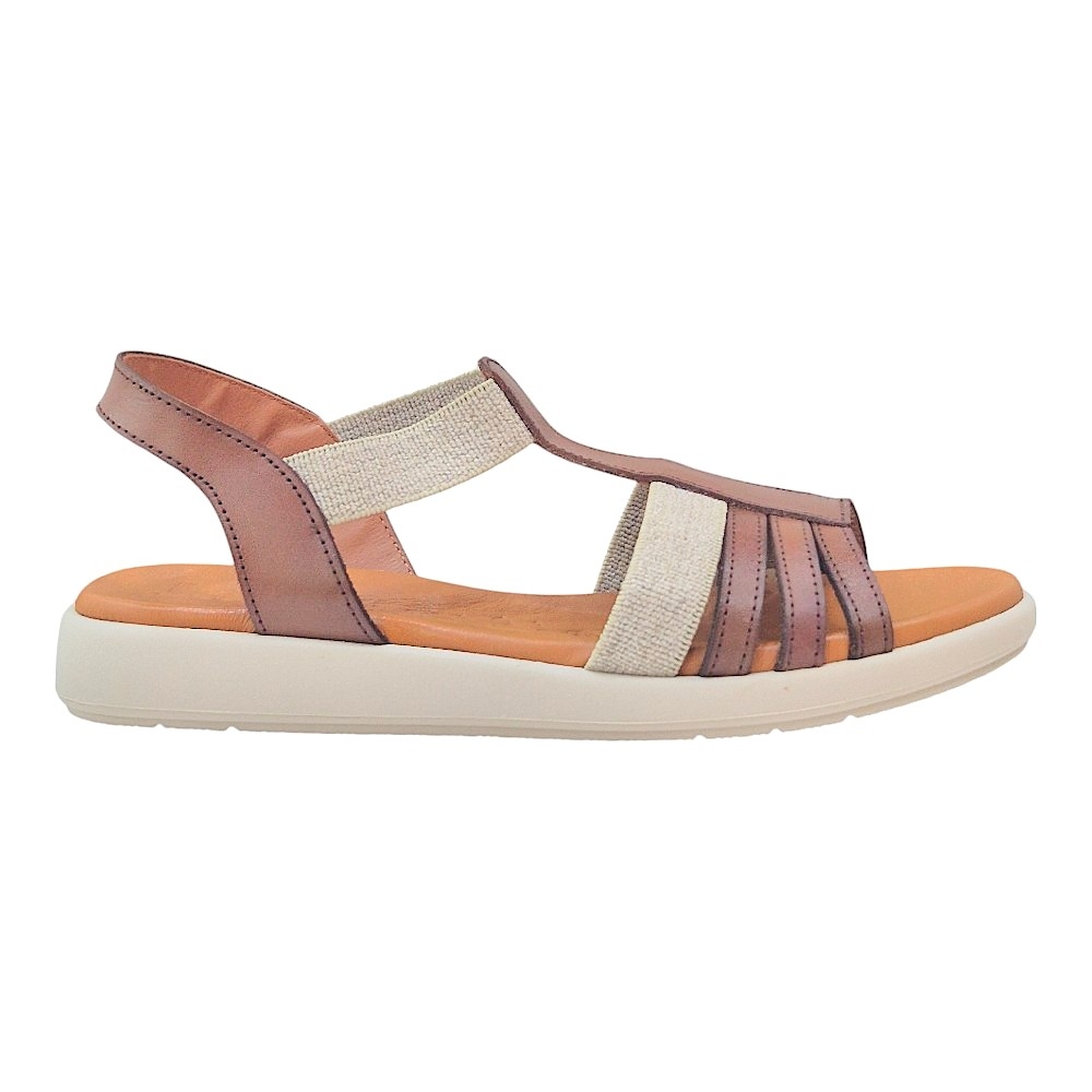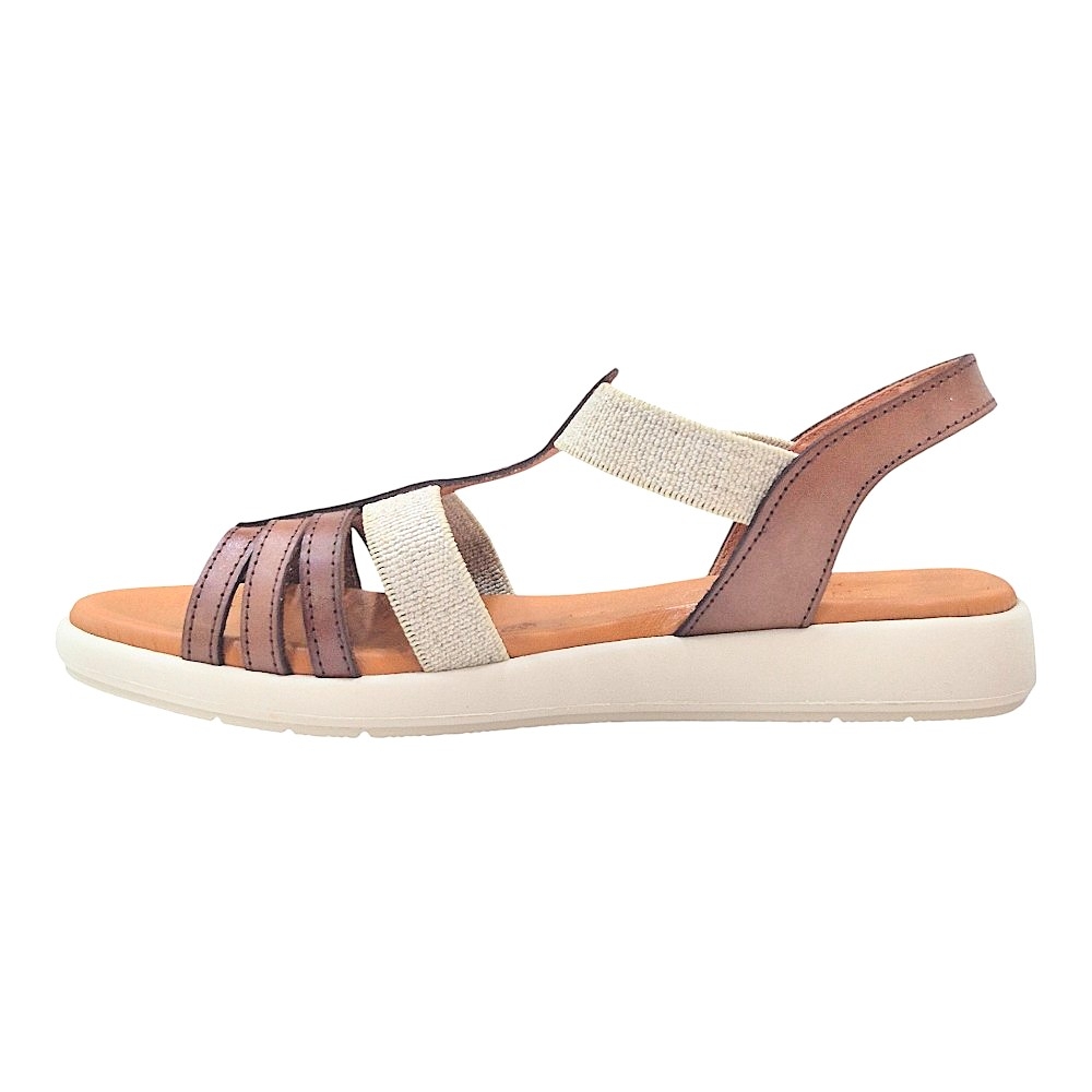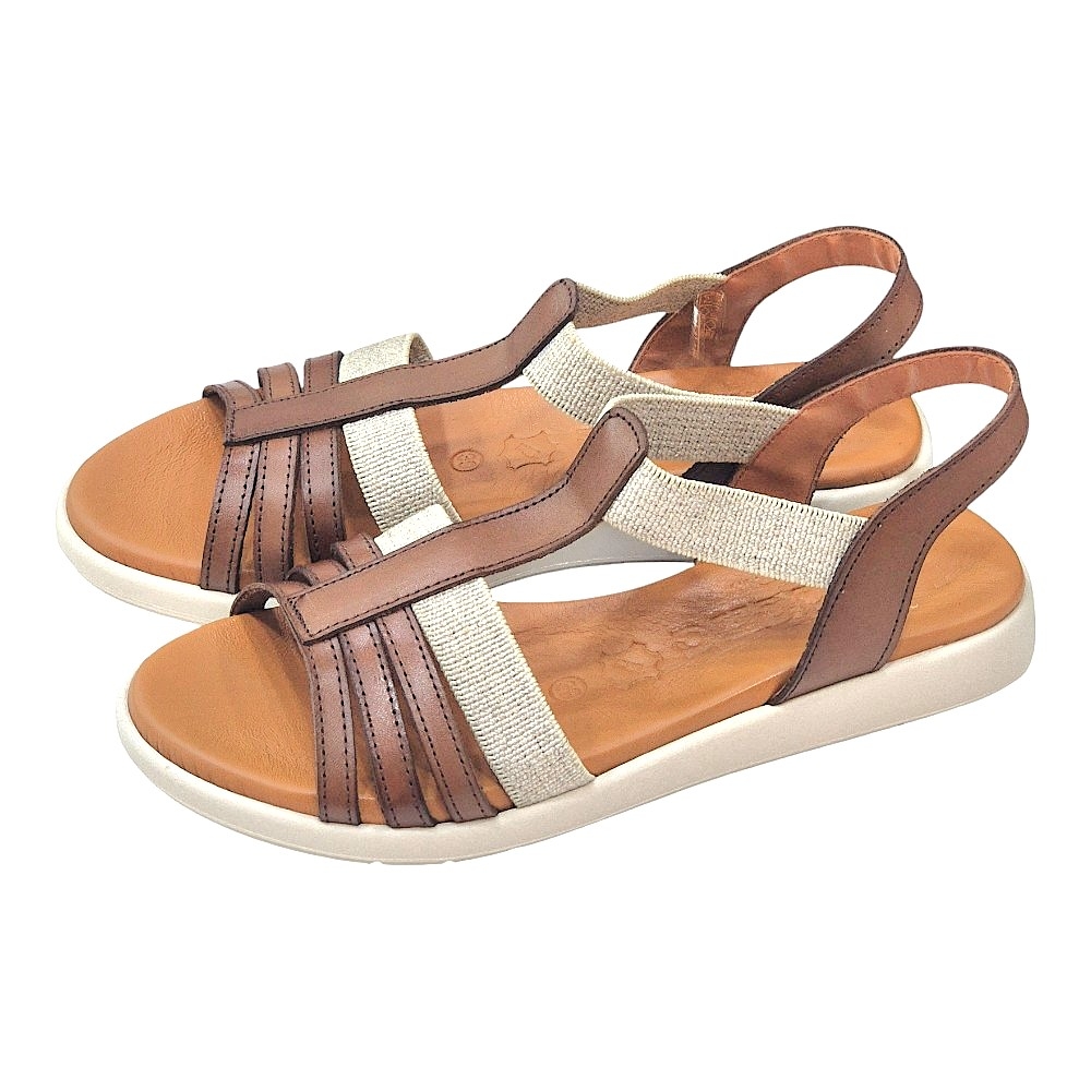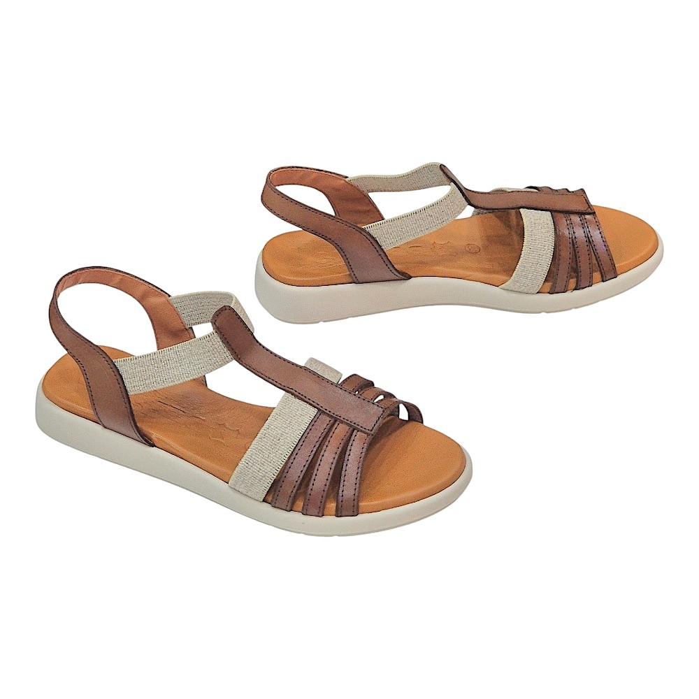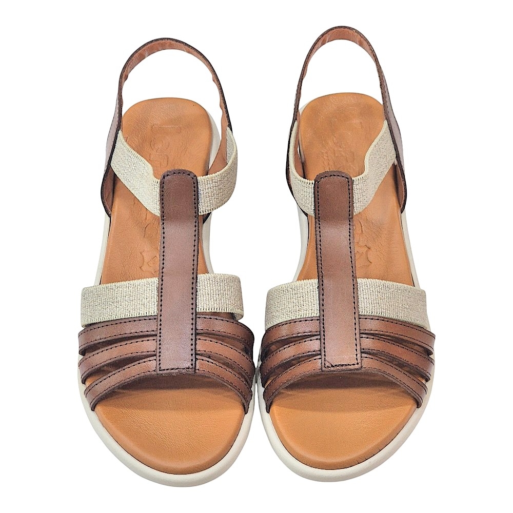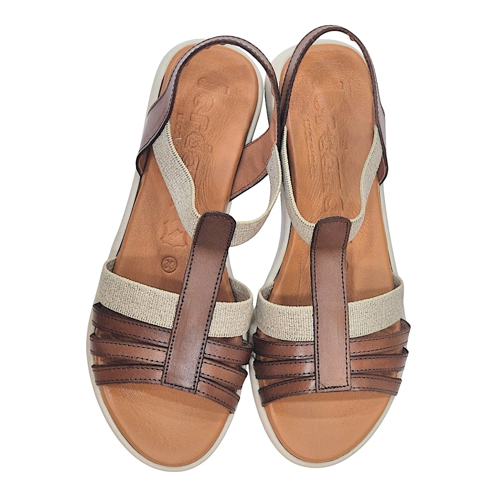 Diseño Elegante y Versátil: El modelo 4692 presenta una armoniosa combinación de tiras en piel de color marrón y detalles en lino color natural, creando un contraste sofisticado que realza cualquier atuendo. Su diseño de pala con múltiples tiras finas en la parte delantera y una tira central tipo "T" estiliza el pie, mientras que la tira elástica en el talón asegura un ajuste cómodo y seguro.