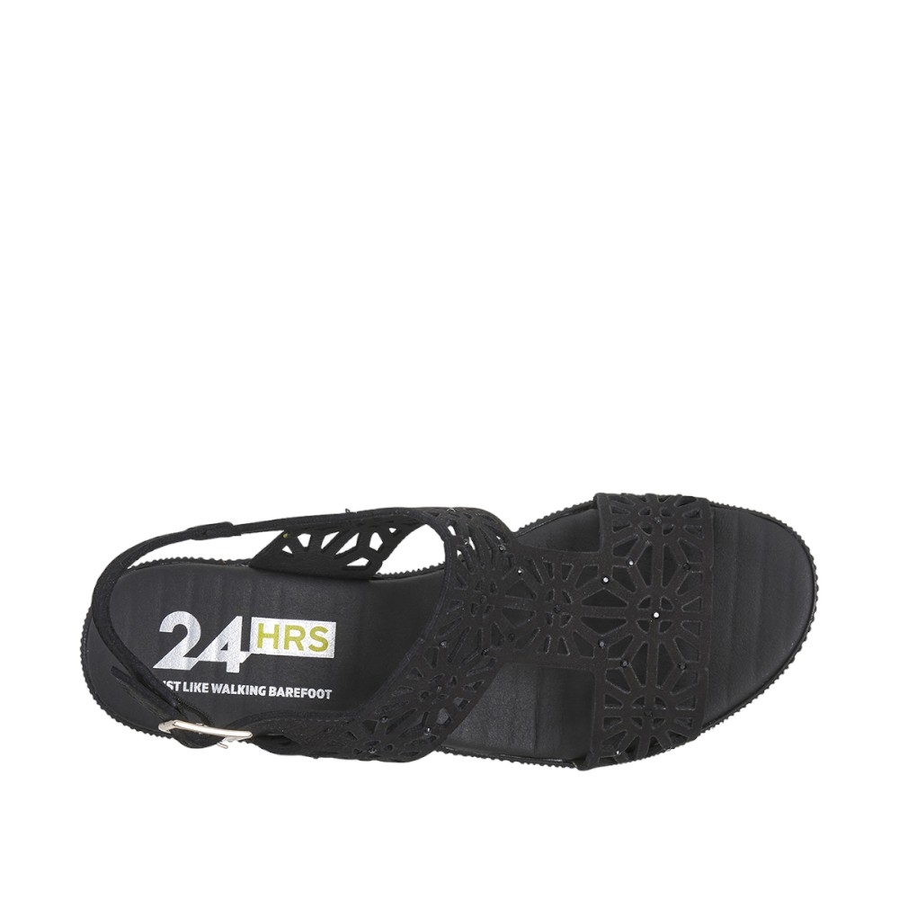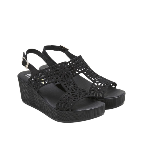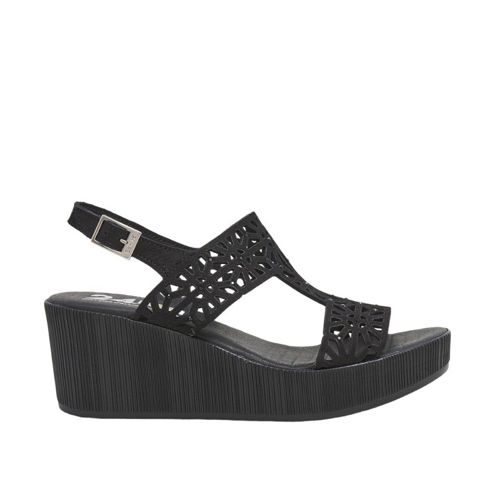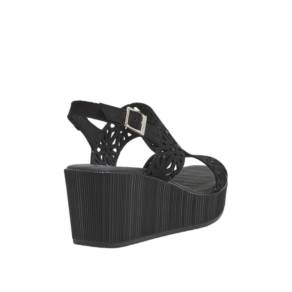 Sandalia mujer diseñada en piel color negro con acabado en nobuck y detalles calados con pedrería. Cierre de hebilla lateral, costuras vistas y suela en PU con cuña de 6,5 cm. Su altura no será un problema gracias a su alto confort. Un modelo perfecto para looks casual y a la vez sofisticados.