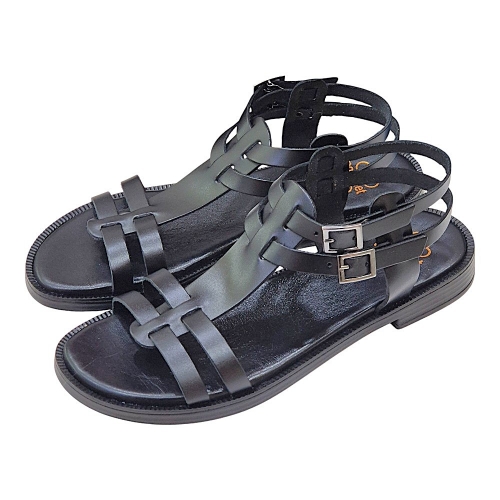 Estas sandalias destacan por su diseño moderno y versátil. Presentan un cuerpo principal con varias tiras de piel dispuestas de forma estratégica sobre el empeine, ofreciendo un ajuste seguro y un toque de sofisticación. El diseño incorpora un cierre con doble hebilla metálica lateral, no solo añadiendo un detalle estético atractivo, sino también permitiendo un ajuste personalizado para mayor comodidad.