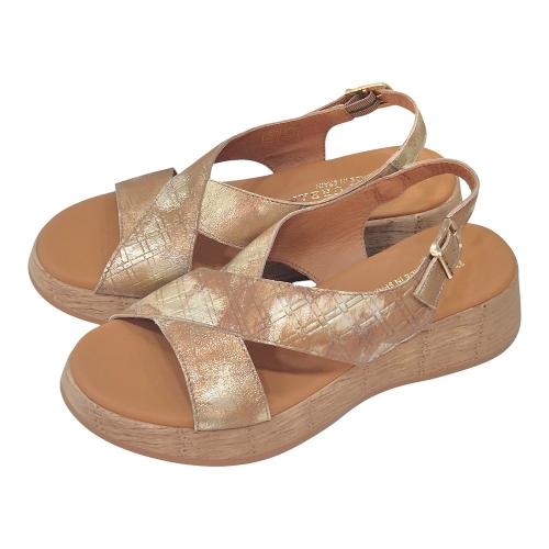 El modelo presenta un atractivo diseño con tiras cruzadas en la parte delantera y una tira trasera con cierre de hebilla ajustable para un ajuste perfecto al pie. El material principal, llamado "Picaso Tostado", es una piel de alta calidad con un acabado metalizado en tonos dorados y un sutil relieve de rombos que le aporta un toque de originalidad y sofisticación.