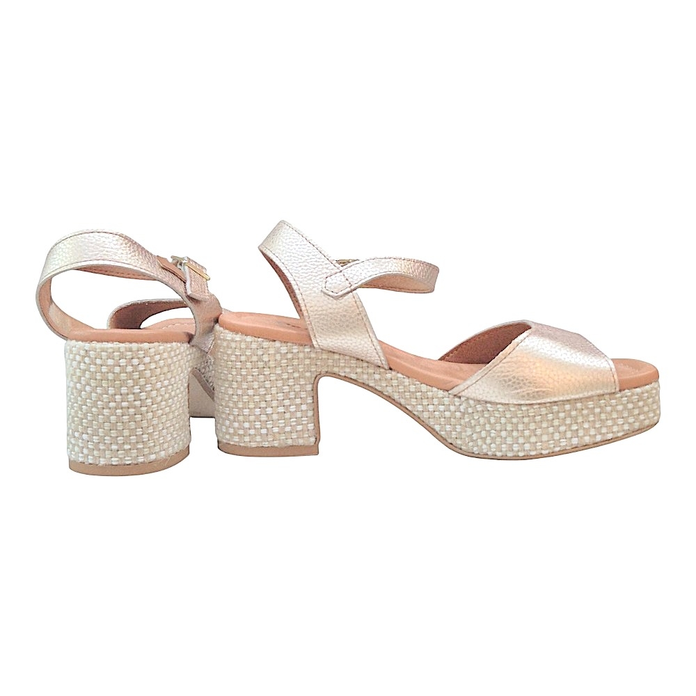 Suela: Plataforma y tacón bloque con acabado textil entrelazado, proporcionando altura sin renunciar a la estabilidad.