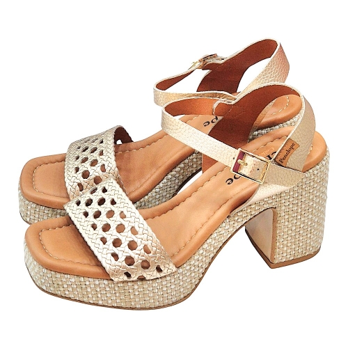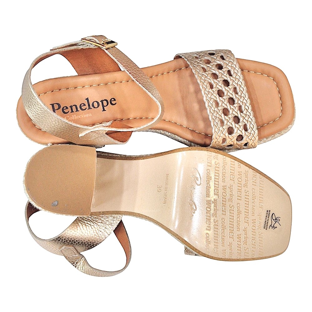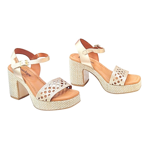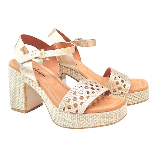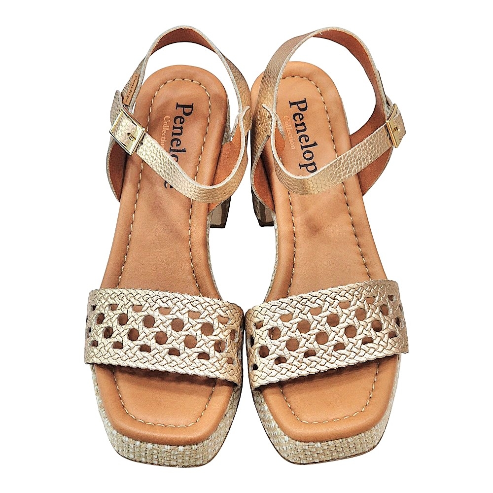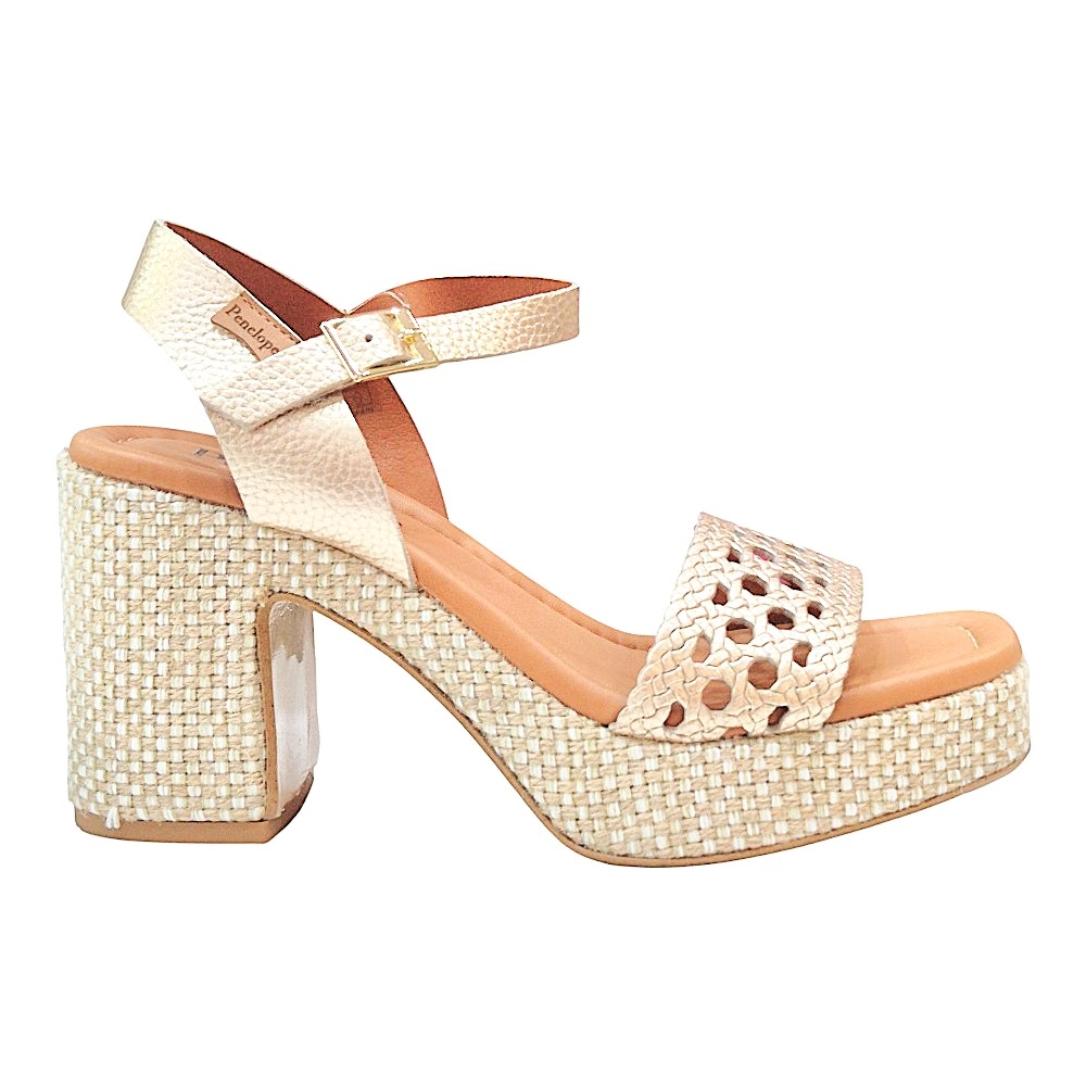 Suela: Acabado de plataforma con trenzado decorativo en tonos naturales y claros.
