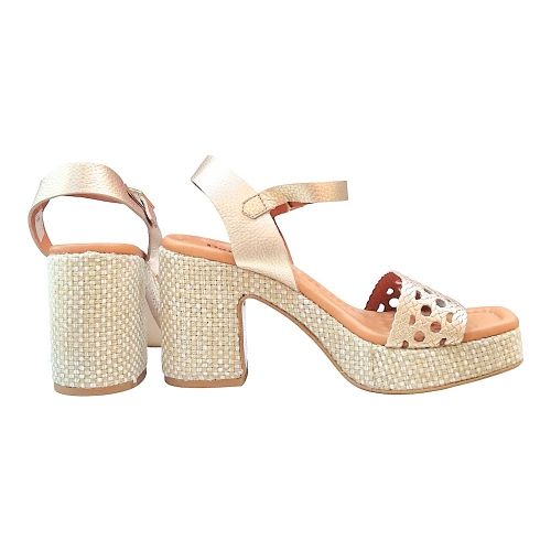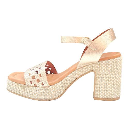 Equipada con una plataforma y tacón ancho revestidos en un material textil de textura orgánica tipo rafia, esta sandalia ofrece una estabilidad excepcional. La combinación de la plataforma delantera y el tacón robusto permite ganar altura sin sacrificar la comodidad en la pisada.