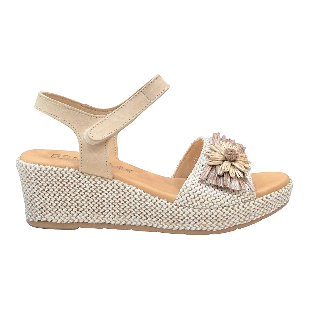 La estructura destaca por su pala ancha con textura trenzada, que evoca un estilo mediterráneo muy actual. El detalle protagonista es un delicado adorno floral en rafia sobre el empeine, aportando un toque femenino y artesanal único.