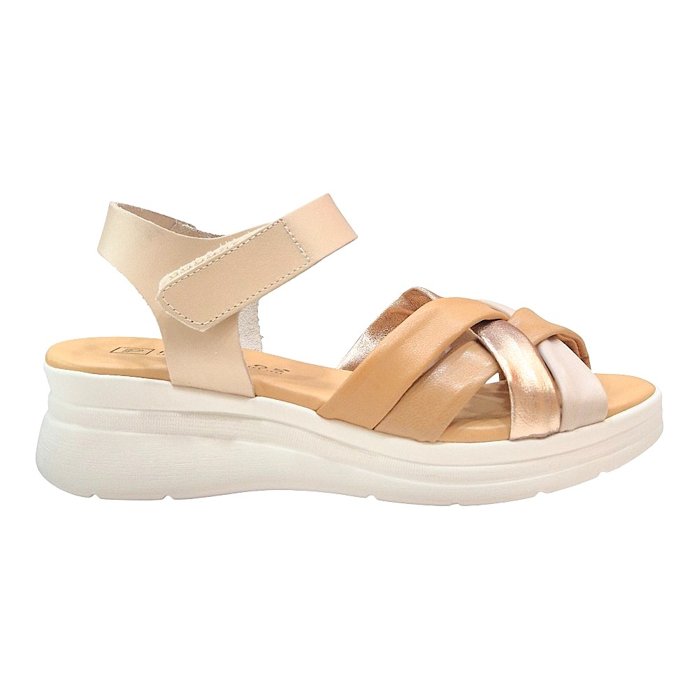 La parte superior está confeccionada con una serie de tiras entrelazadas que mezclan acabados en piel lisa y metalizados en tonos bronce, creando un contraste visual muy atractivo. Su estructura de pala cruzada no solo embellece el pie, sino que también ofrece una sujeción segura y confortable.