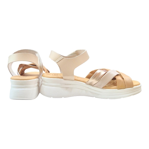 La sandalia incorpora una suela ligera de tono claro con una discreta cuña que proporciona la altura justa para estilizar la figura sin renunciar a la estabilidad. Su relieve inferior mejora la adherencia, ofreciendo seguridad en cada paso sobre diferentes superficies.