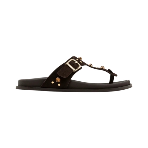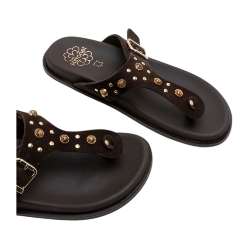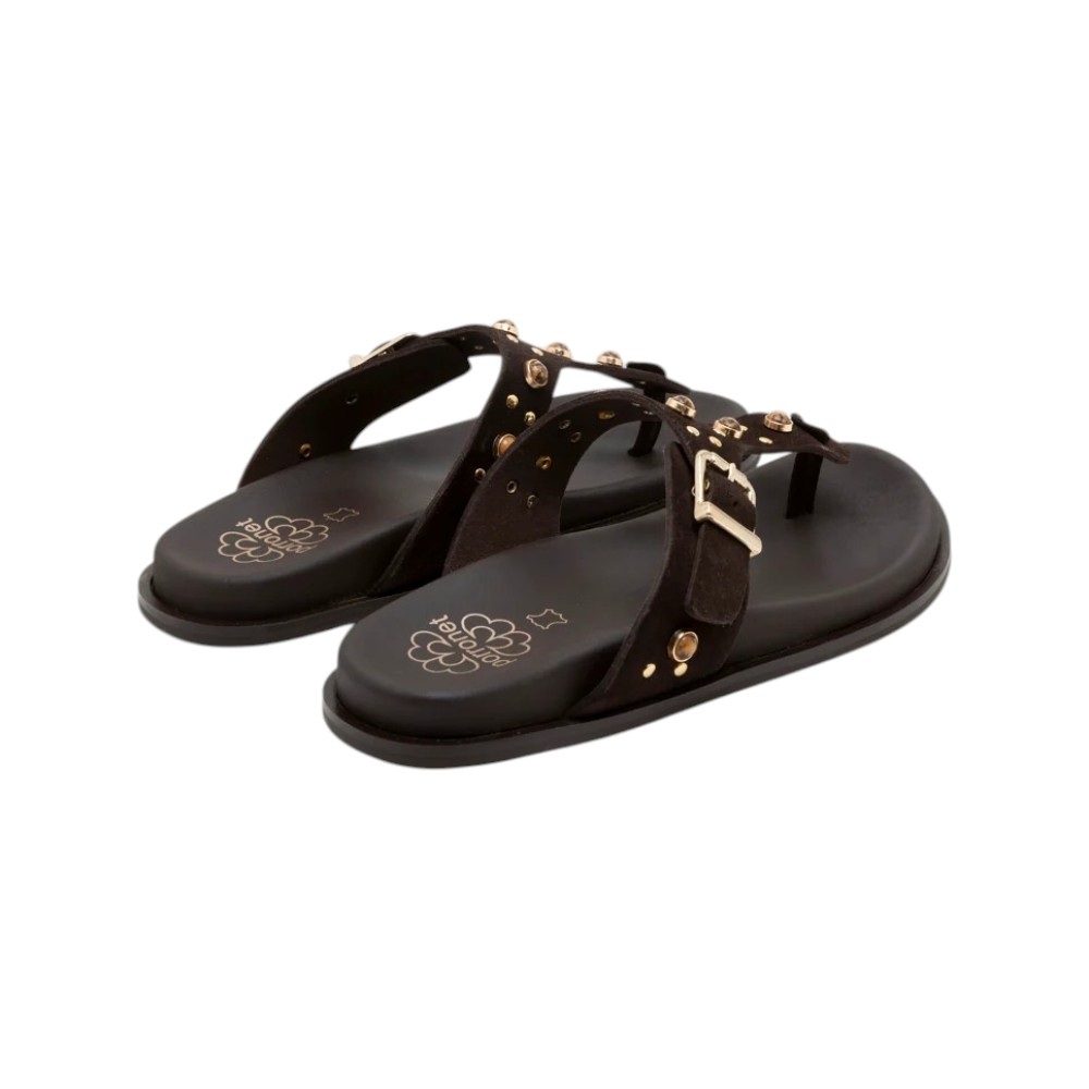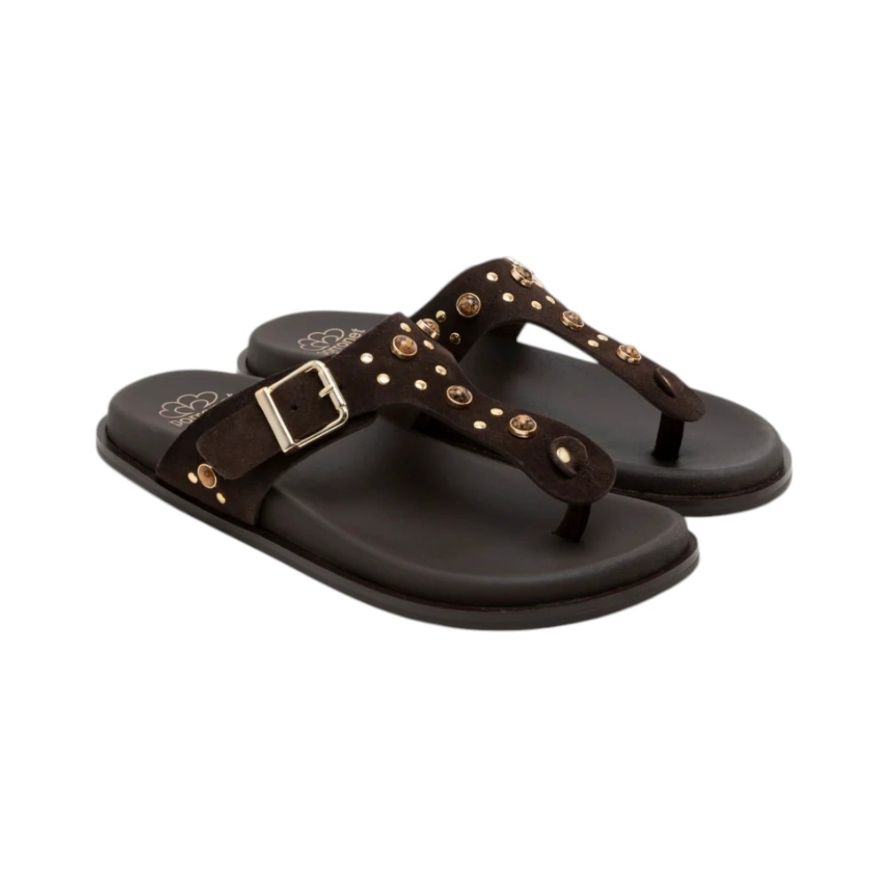 Este modelo tipo esclava destaca por su refinado tono Moka, un marrón profundo y versátil que complementa cualquier paleta de colores. El empeine está elaborado en piel de vaquetilla de primera calidad, adornado meticulosamente con pedrería multicolor y pequeñas tachuelas doradas que capturan la luz a cada paso. Además, cuenta con una hebilla lateral ajustable que permite un calce perfecto y personalizado.