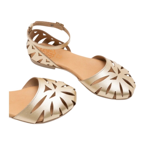 Estas sandalias destacan por su exquisito trabajo de piel troquelada tanto en la pala como en el talón, creando un patrón geométrico que no solo es estéticamente atractivo, sino que también favorece la transpirabilidad del pie. El cierre mediante pulsera al tobillo con hebilla ajustable garantiza una sujeción personalizada y segura.