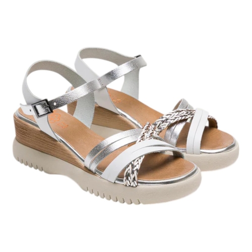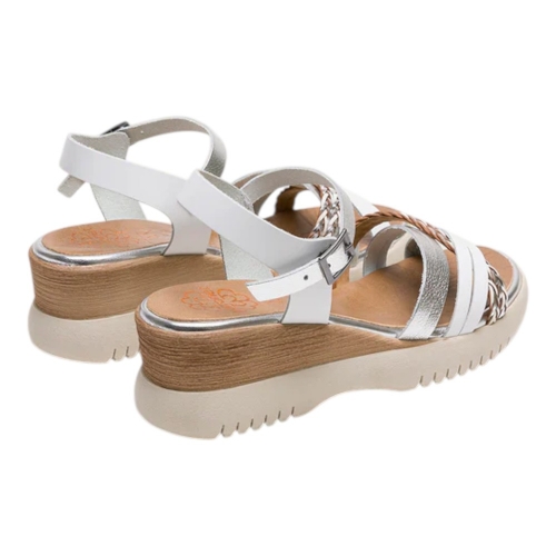Sandalia de cuña de piel con original pala de tiras cruzadas. Cierre con tira ajustable de hebilla en el tobillo. Plantilla acolchada de piel que garantiza una gran comodidad. Cuña de 5 cm y 2 cm de plataforma. Fabricado artesanalmente en España.