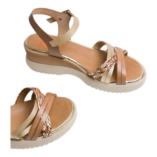 Sandalia de cuña de piel con original pala de tiras cruzadas. Cierre con tira ajustable de hebilla en el tobillo. Plantilla acolchada de piel que garantiza una gran comodidad. Cuña de 5 cm y 2 cm de plataforma. Fabricado artesanalmente en España.