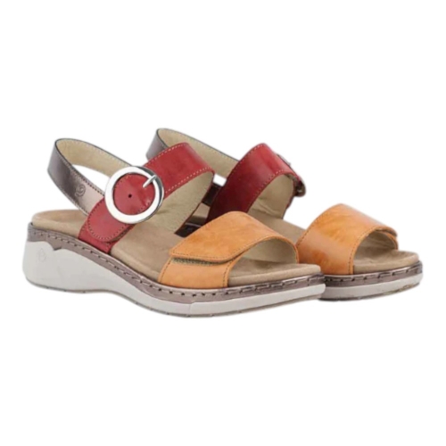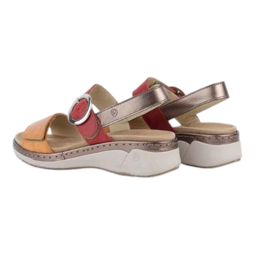 Sandalia doble cierre adhesivo delantero y empeine con hebilla como decoración. Piel natural lisa roja en combinación con piel natural lisa naranja y metalizado marrón. Plantilla extraíble, anatómica y lavable en piel. Piso Azores con una altura aprox. de 4’5 cms.
