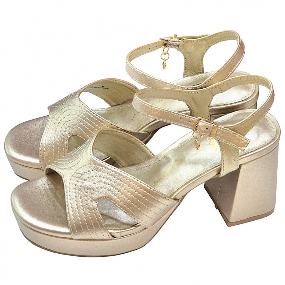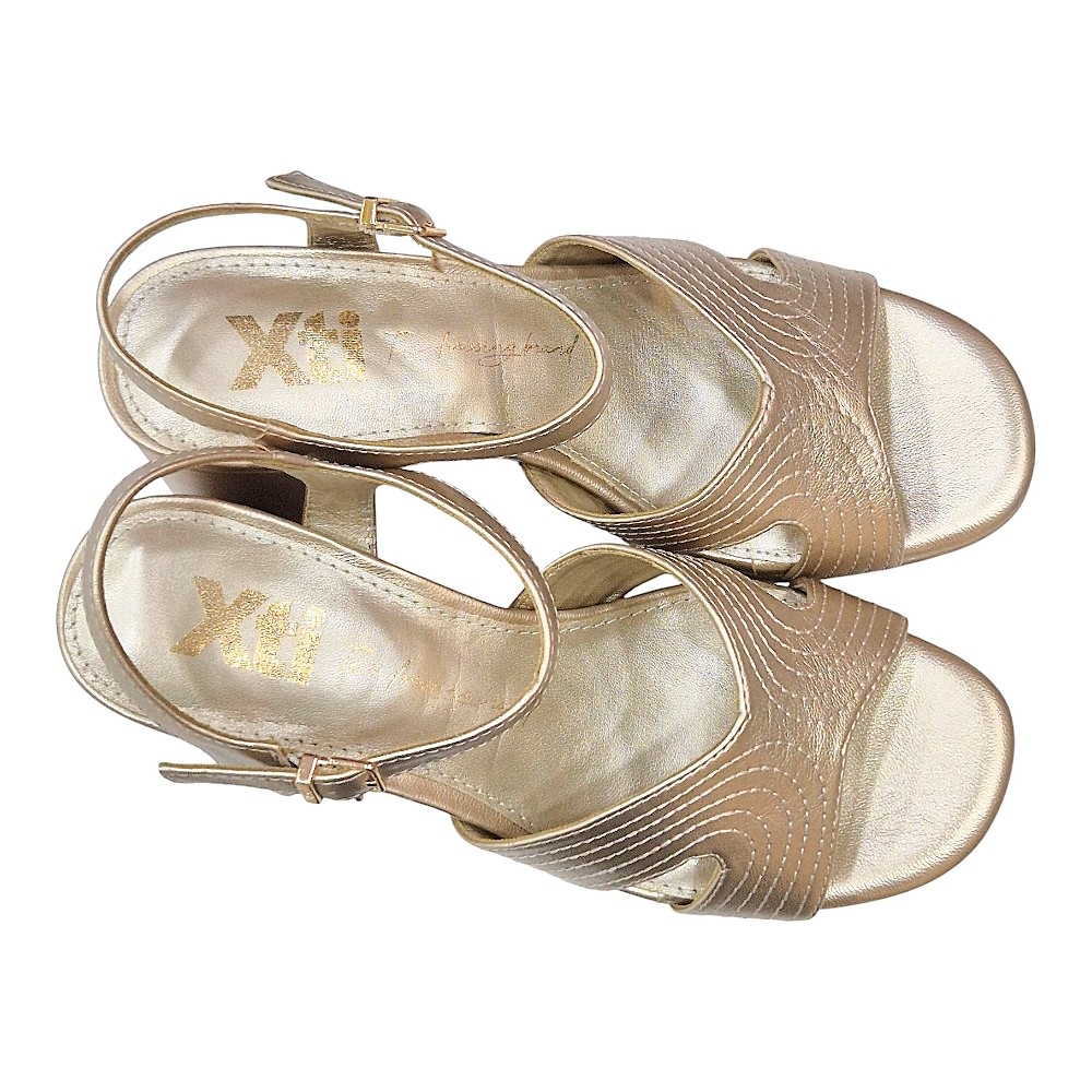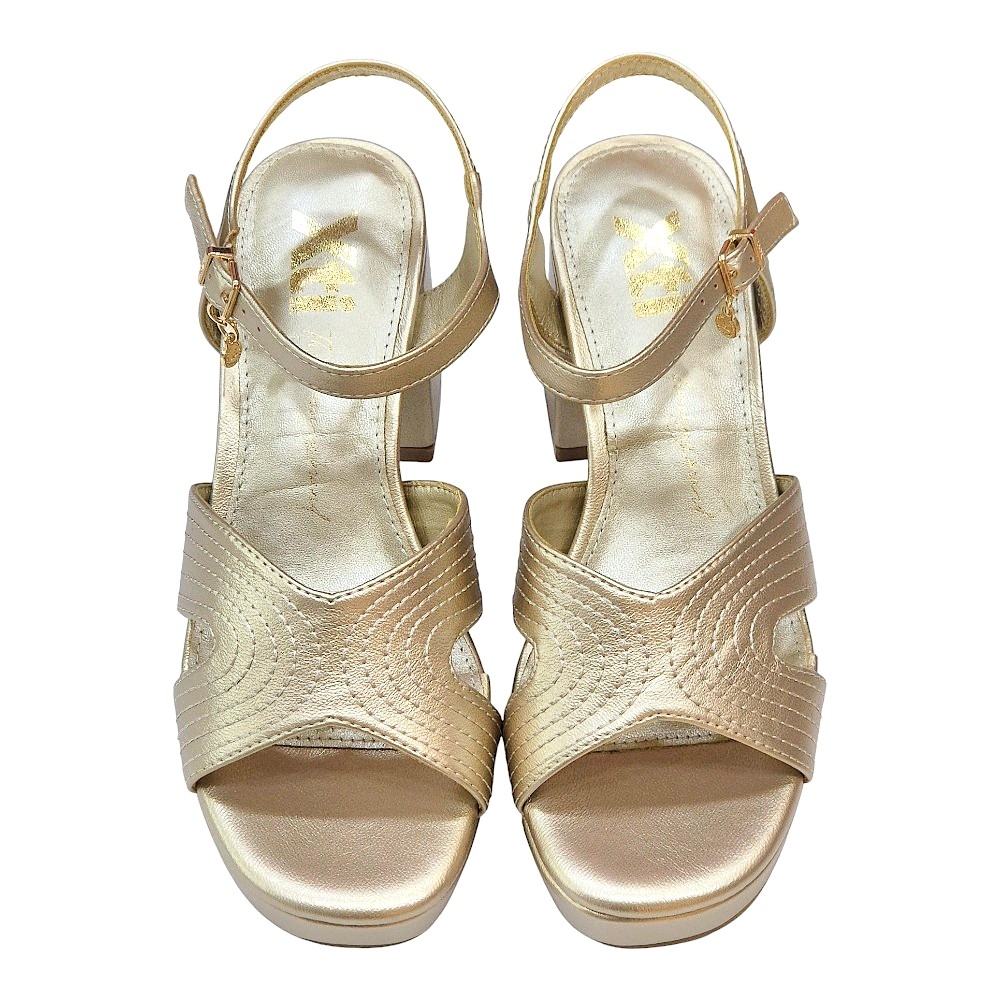Estas sandalias destacan por su pala frontal de diseño ergonómico, compuesta por tiras anchas cruzadas que presentan un elegante bordado de líneas onduladas. El acabado metalizado en oro aporta una luminosidad excepcional, convirtiéndolas en el accesorio perfecto para bodas, comuniones o cenas de gala.