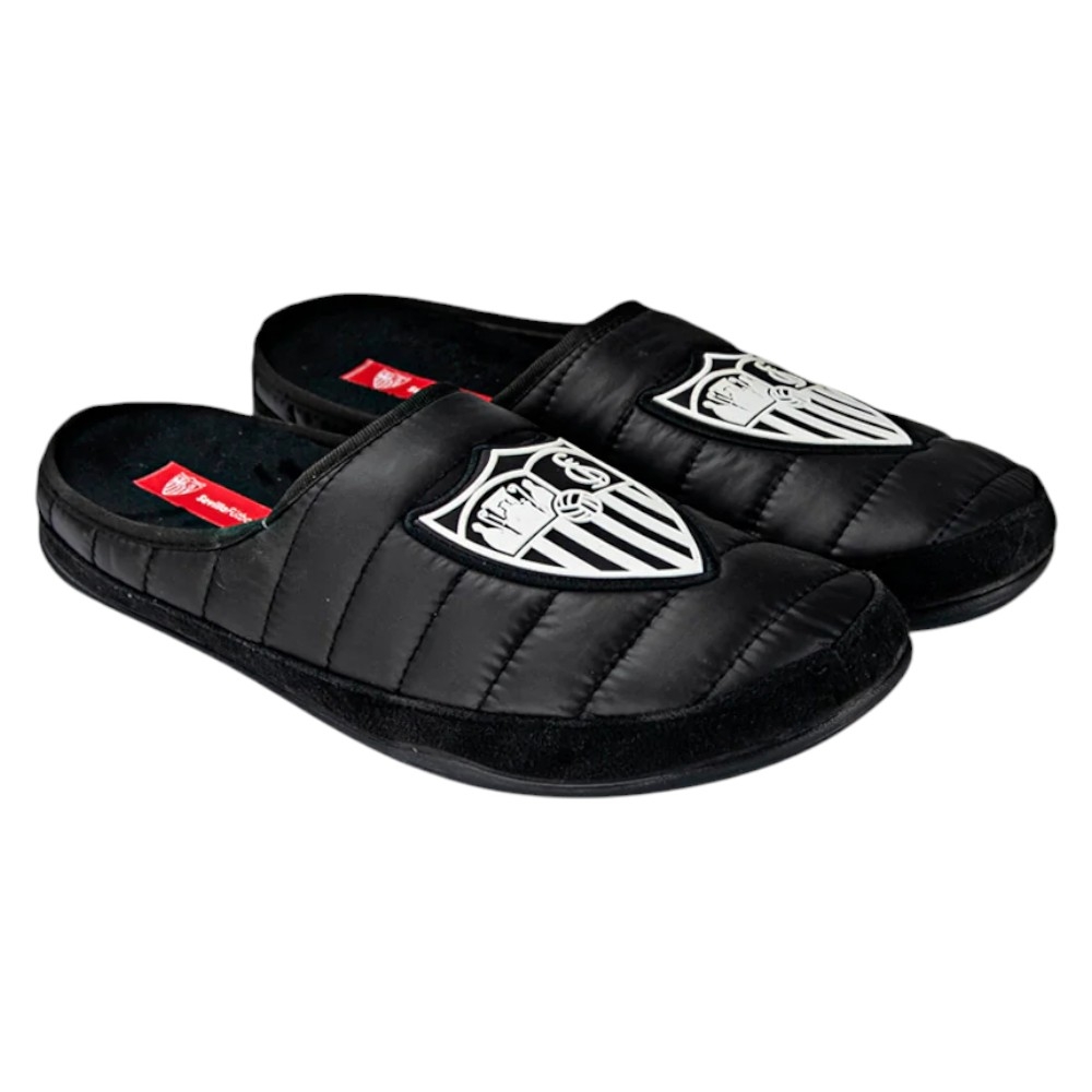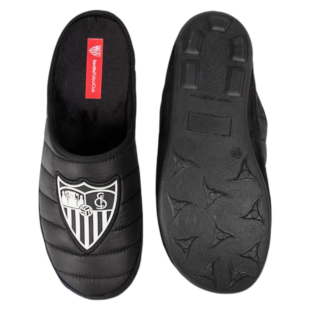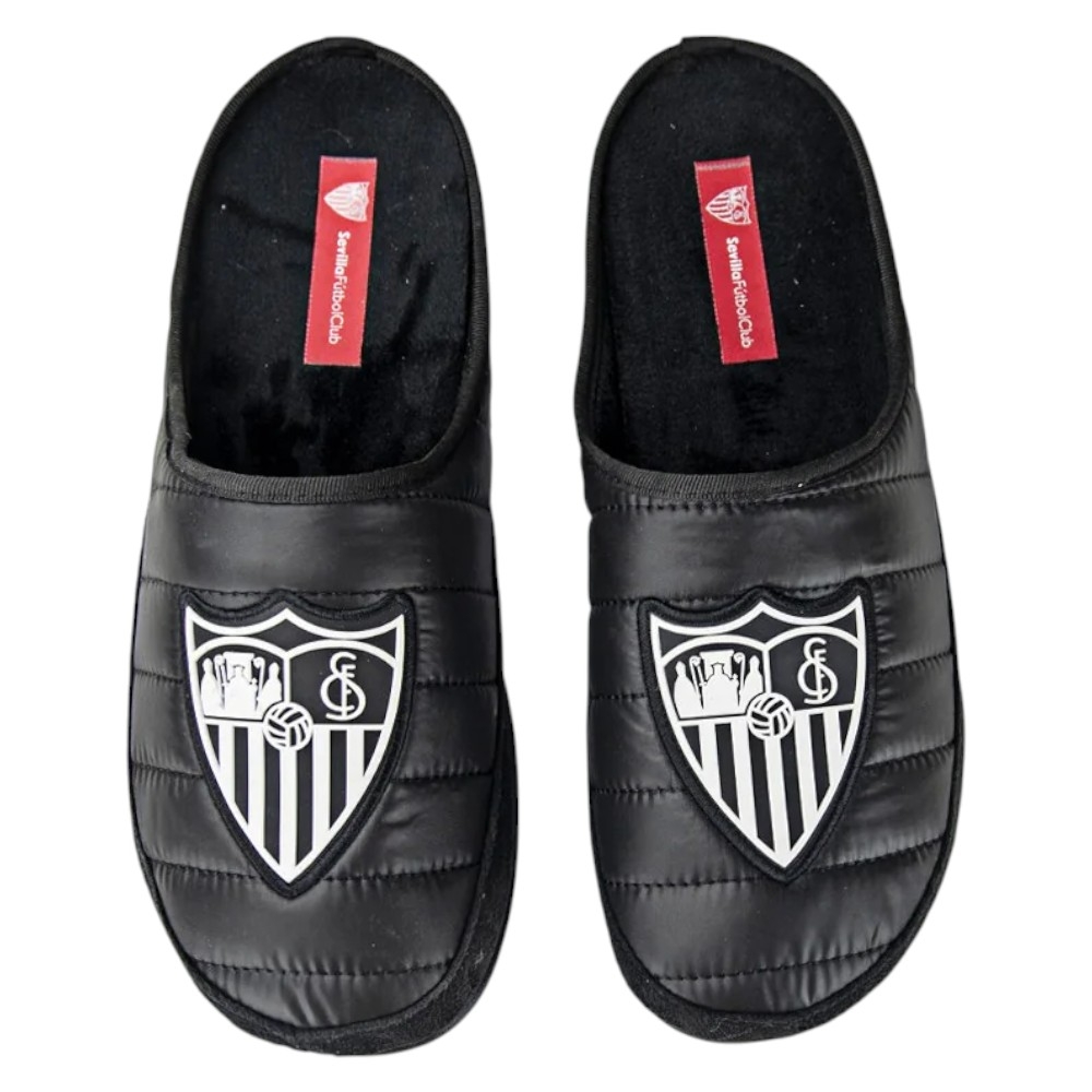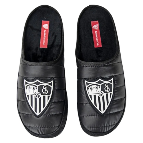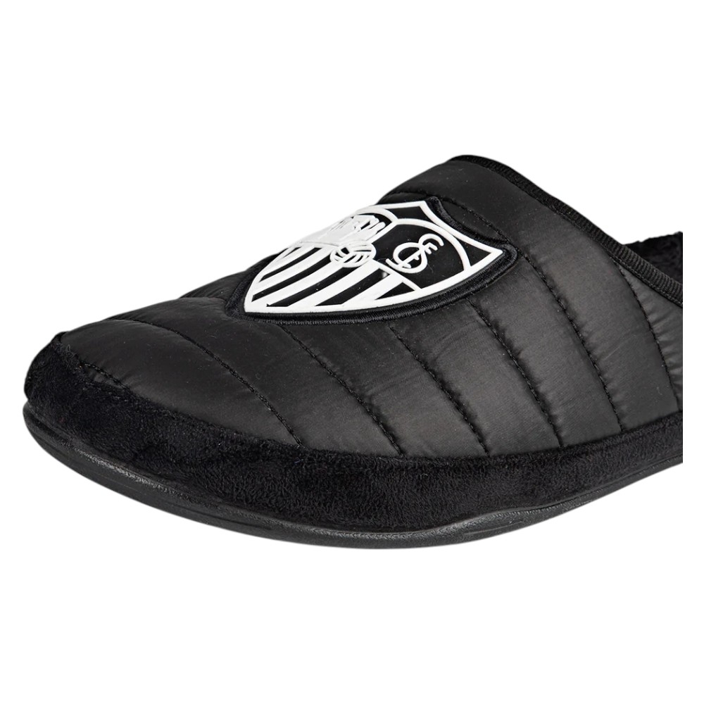 Estas zapatillas de casa del Sevilla Fútbol Club combinan la máxima comodidad con un diseño inconfundiblemente sevillista. Confeccionadas en un moderno tejido amatista de color negro, destacan por el gran escudo del club prominentemente bordado en el empeine. Son una combinación ganadora que te aseguramos que no querrás quitarte.