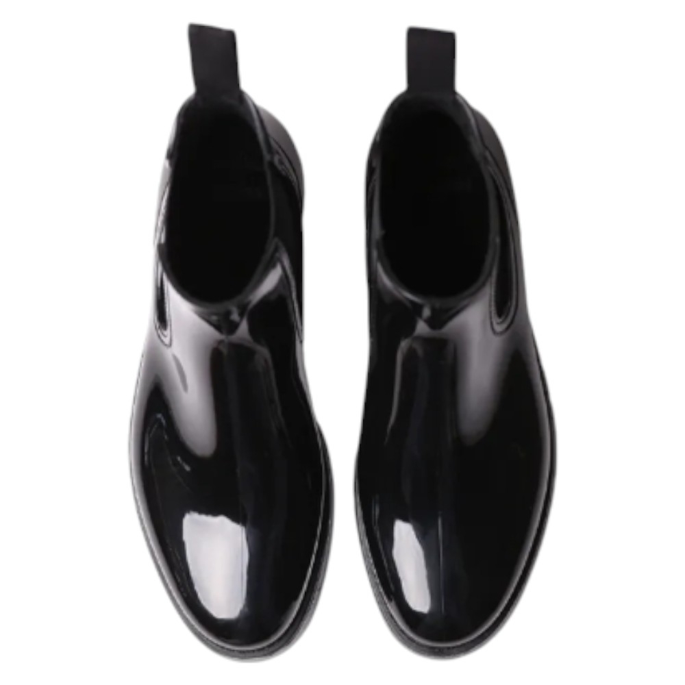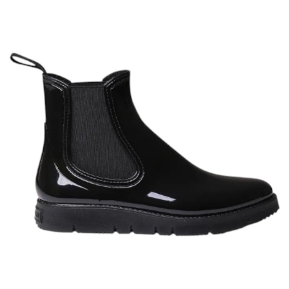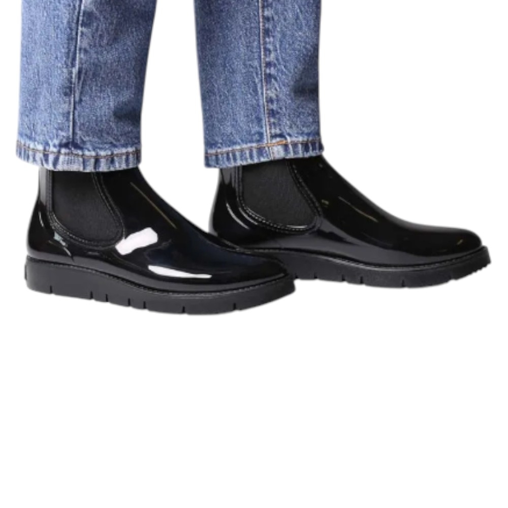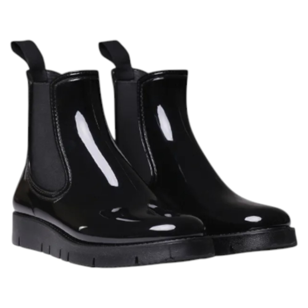 Este botín de agua para mujer se elabora íntegramente en goma con un acabado brillante en color NEGRE/BLACK (Negro), lo que garantiza su impermeabilidad y añade un detalle de estilo.