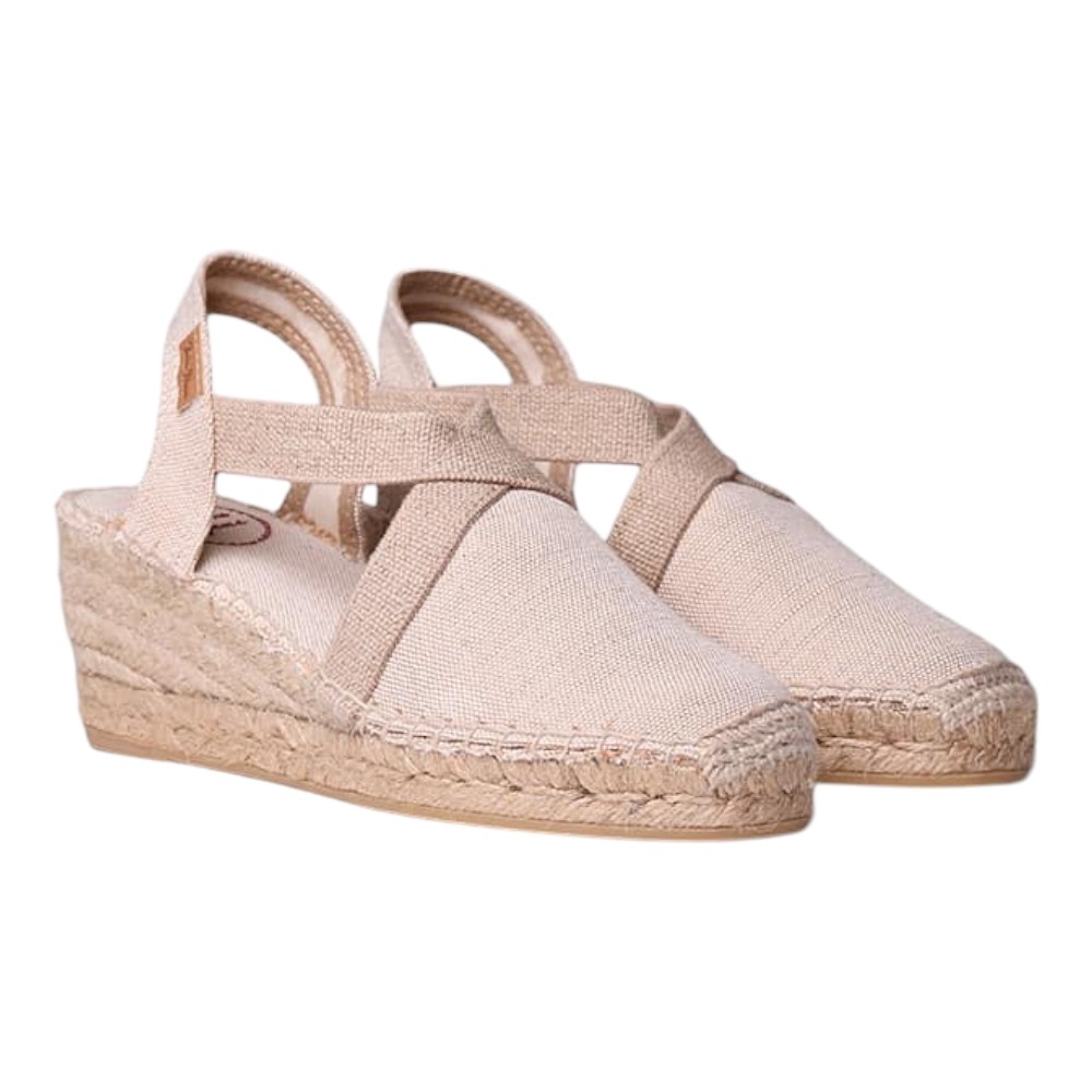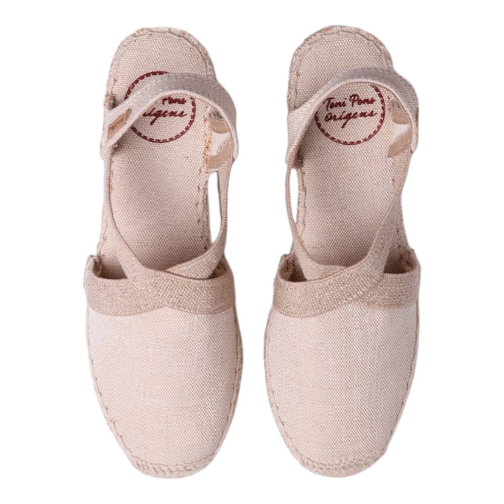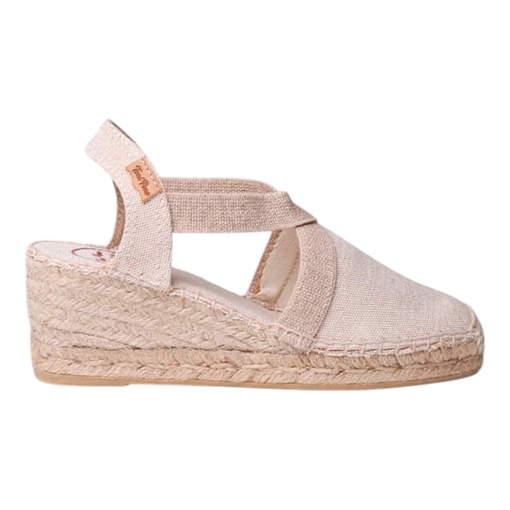 TERRA-V de TONI PONS. Alpargata para mujer elaborada en tela, se elabora en tono crudo. La cuña tiene una altura total de 6 cm de los cuales 4 cm pertenecen al tacón y 2 cm a la suela. Toda la cuña exterior está hecha de yute y goma. La planta interior está forrada en tejido. La unión del tejido y la suela está cosida a mano con un hilo de algodón y tiene un refuerzo en la punta para mayor sujeción.