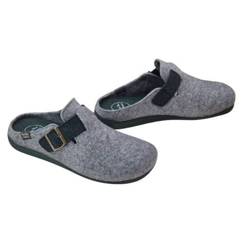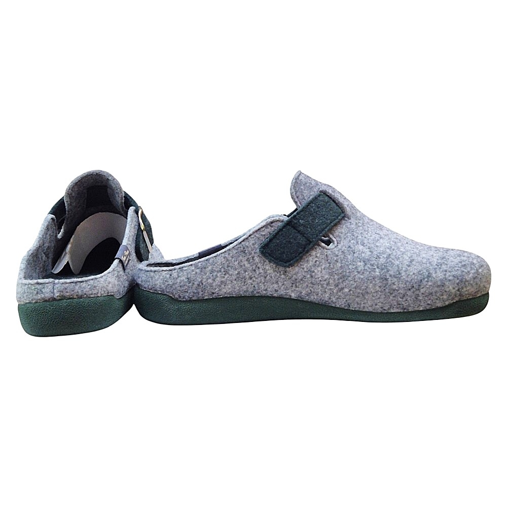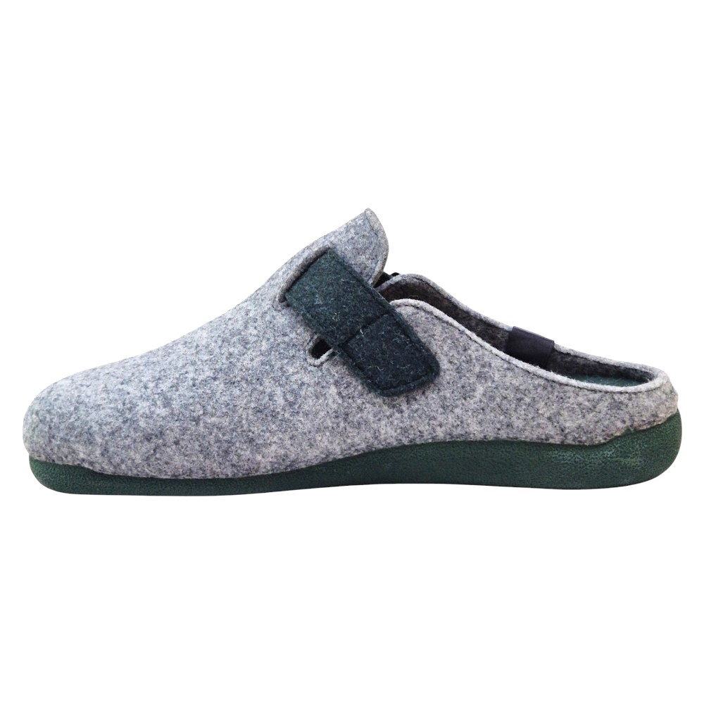 Suela Antideslizante: Cuentan con una suela de goma antideslizante (de 3 cm de grosor aproximadamente), que proporciona seguridad y estabilidad en todo tipo de suelos interiores. La suela y la plantilla, junto con la correa de la hebilla, presentan un color de contraste, que en este modelo gris es un tono oscuro (verde oscuro/caqui), añadiendo un toque distintivo.