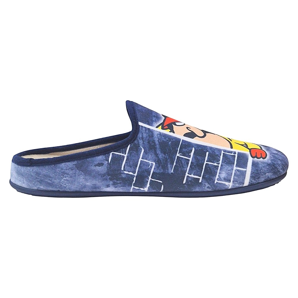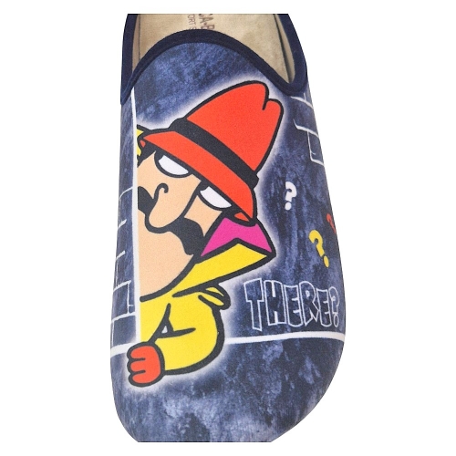 El fondo en tono azul marino con un patrón que simula una pared de ladrillos crea el ambiente perfecto para esta escena de intriga. Confeccionadas con una suave y cálida felpa interior, estas zapatillas te mantendrán cómodo y abrigado en casa. La suela de goma antideslizante ofrece una pisada segura en cualquier tipo de suelo.