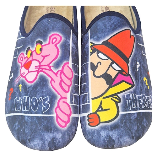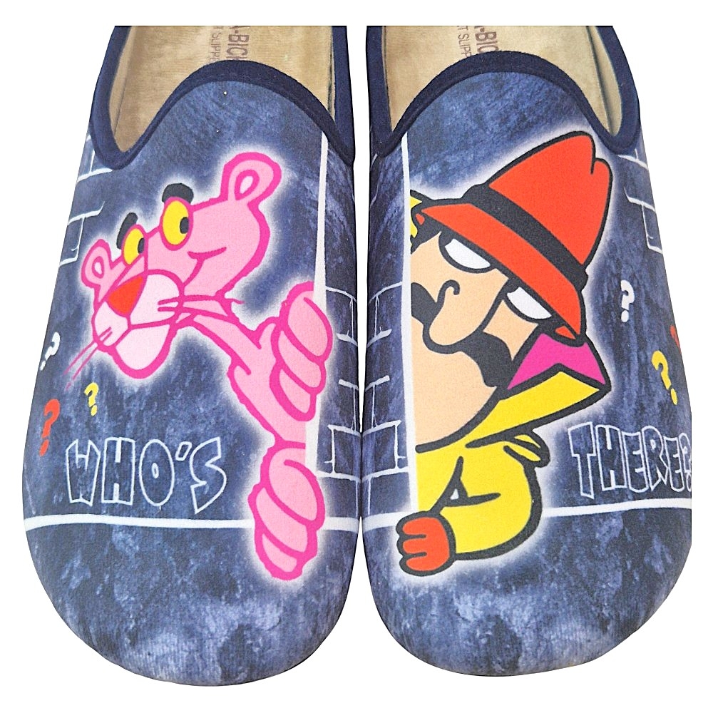 Estas zapatillas de estilo mule, fáciles de poner y quitar, exhiben un diseño lleno de diversión. En la zapatilla izquierda, la Pantera Rosa asoma con el texto "¿QUIÉN?", mientras que en la derecha, el Inspector Clouseau se muestra con la frase "¿HAY ALGUIEN?". Juntas, forman un dúo inseparable con el simpático mensaje "¿QUIÉN HAY AHÍ?".