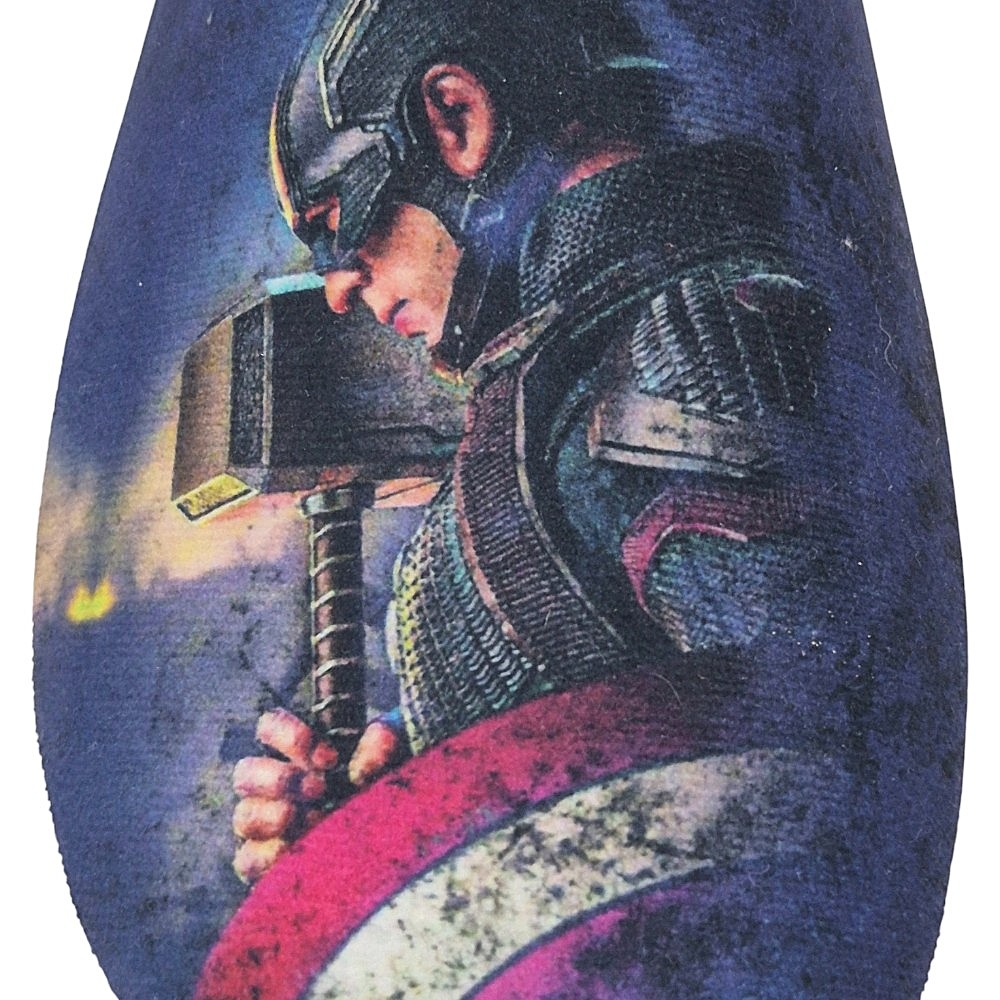 El estampado es el protagonista: una imagen icónica y detallada del Capitán América empuñando el poderoso martillo Mjölnir y sosteniendo su escudo, una de las escenas más aclamadas de la saga de Los Vengadores.