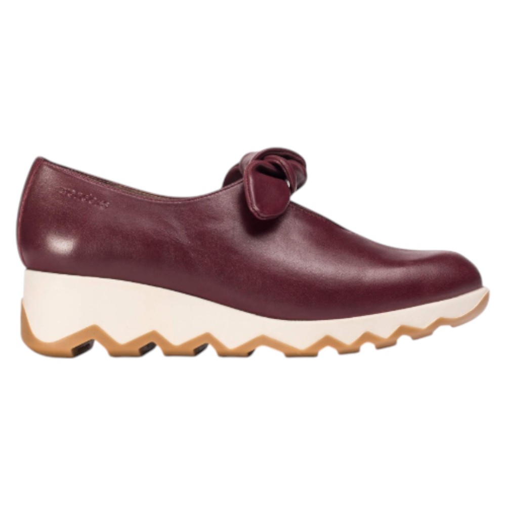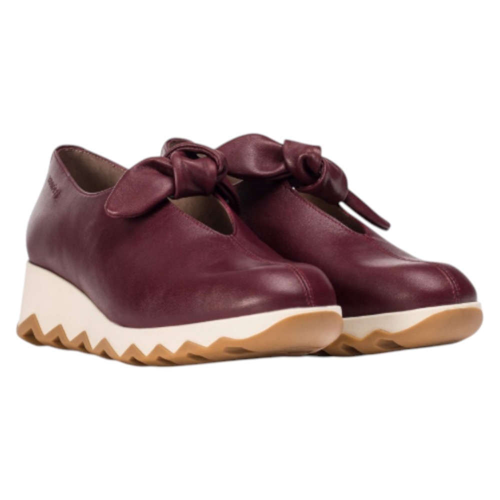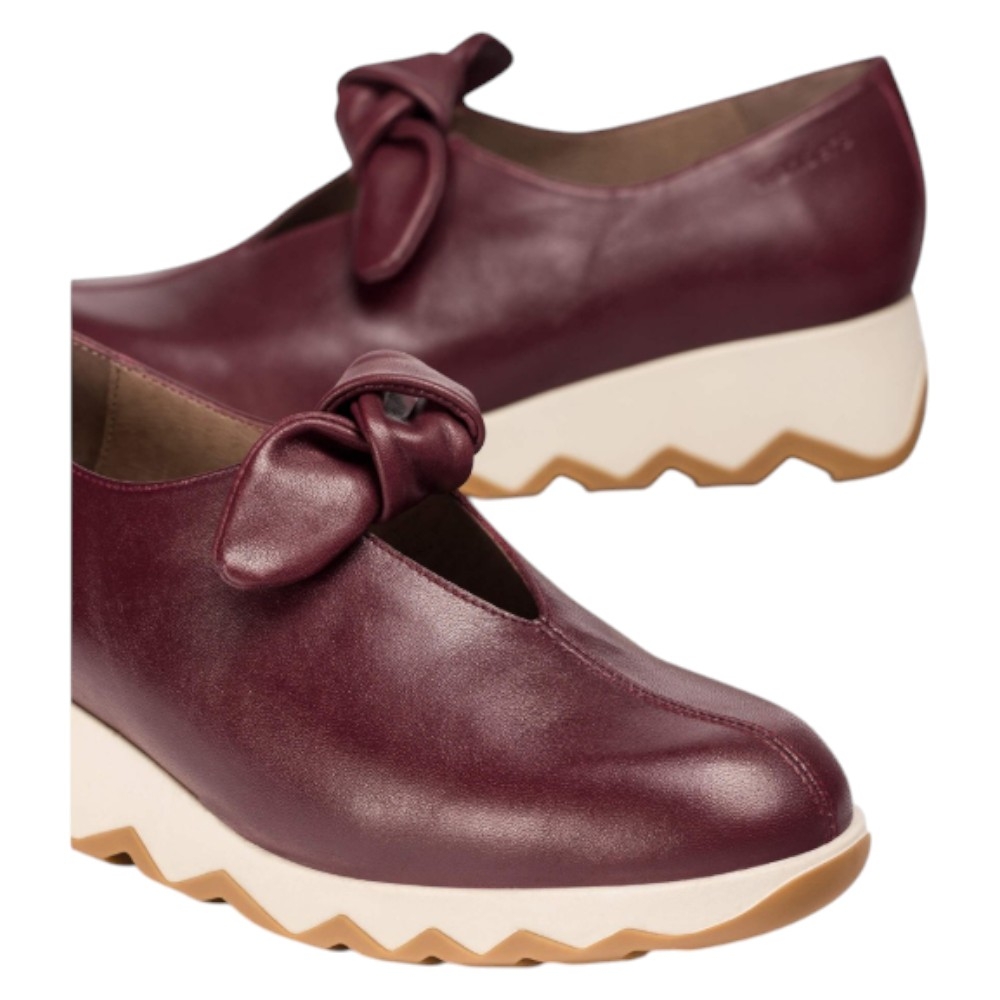 Su diseño minimalista y de silueta cerrada destaca por un coqueto detalle de nudo en el escote, que añade un toque distintivo y femenino. La comodidad está garantizada gracias a su suela de cuña media (4 cm) que equilibra la altura. La innovadora suela dentada bicolor (blanco y caramelo/goma) no solo aporta un aire contemporáneo, sino que también ofrece una pisada segura y es excepcionalmente ligera y confortable, desarrollada con tecnología EvoLight.