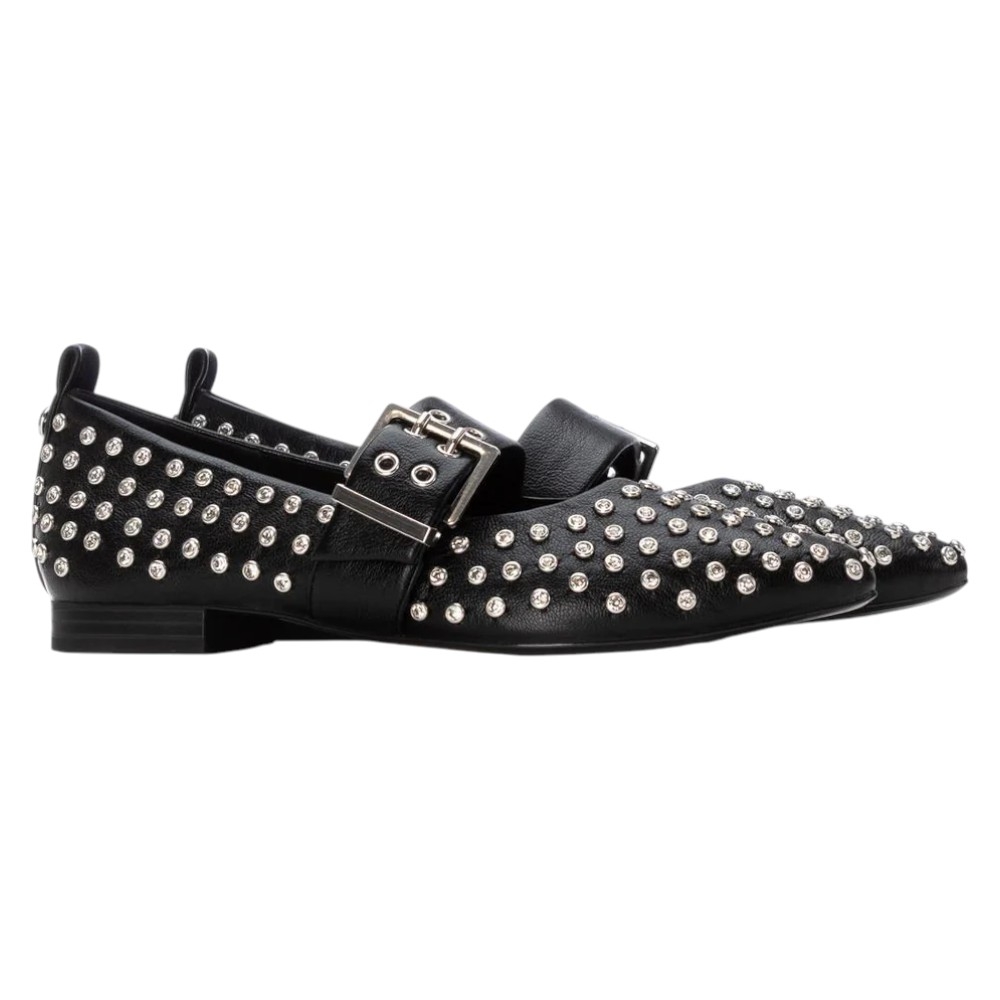 Diseño Sofisticado: Confeccionadas en un material de alta calidad que imita la piel, estas bailarinas destacan por su llamativa decoración con tachuelas metálicas que incorporan pequeños cristales brillantes. Este detalle añade un brillo sutil y un aire sofisticado a su diseño de punta afilada.