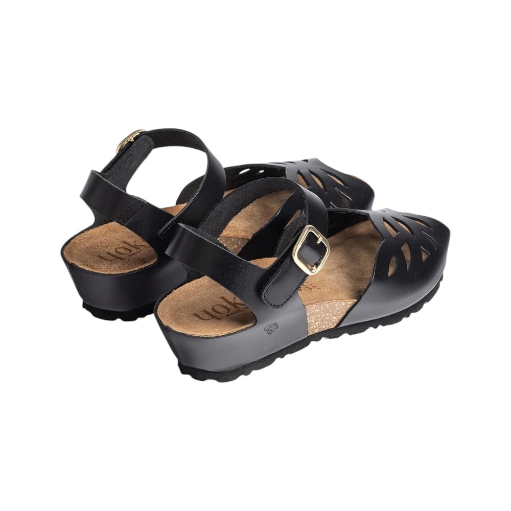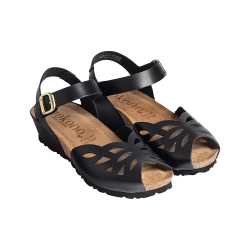 Las sandalias Mónaco-003 en color negro son el equilibrio perfecto entre un diseño sofisticado y la funcionalidad necesaria para tu día a día. Firmadas por Yokono, estas sandalias de cuña baja destacan por su exquisito diseño troquelado en la parte delantera, que no solo aporta un toque femenino y original, sino que las convierte en el calzado más fresco y favorecedor para estrenar el verano.