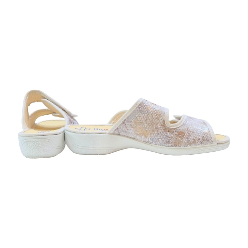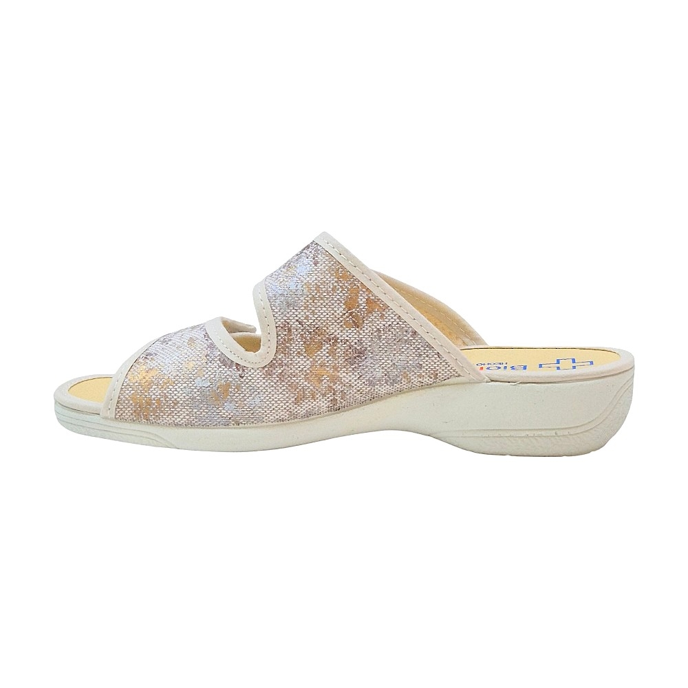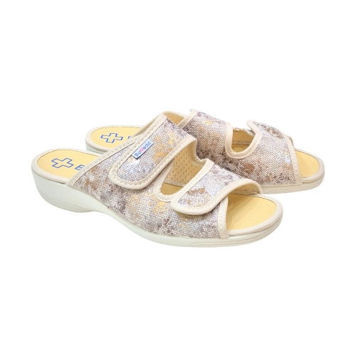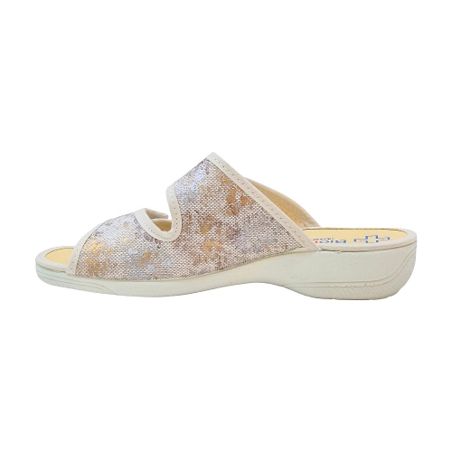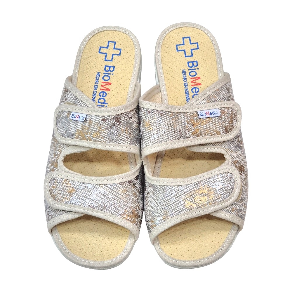 Acabado Aura Beige: Su tejido exterior presenta un estampado texturizado con toques dorados y plateados que aportan un aire moderno y sofisticado a una zapatilla de descanso.