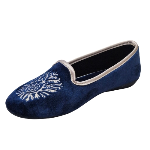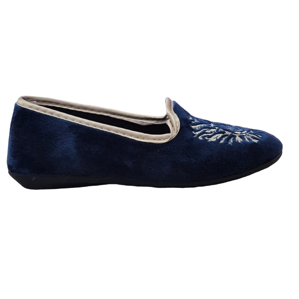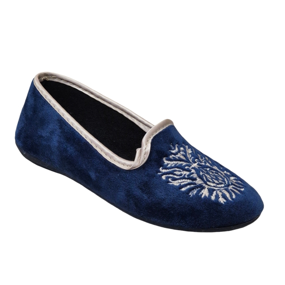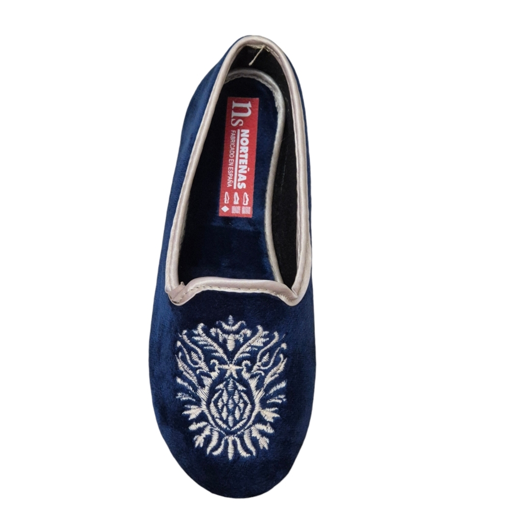 Este elegante zapato de mujer de la marca Norteñas está confeccionado en suave terciopelo azul marino. Destaca un exquisito bordado blanco crema en la parte delantera, con un diseño floral que evoca la artesanía tradicional. El interior del zapato, lleva la etiqueta de la marca Norteñas, símbolo de calidad y tradición. Fabricado en España, este zapato combina a la perfección estilo clásico y comodidad.