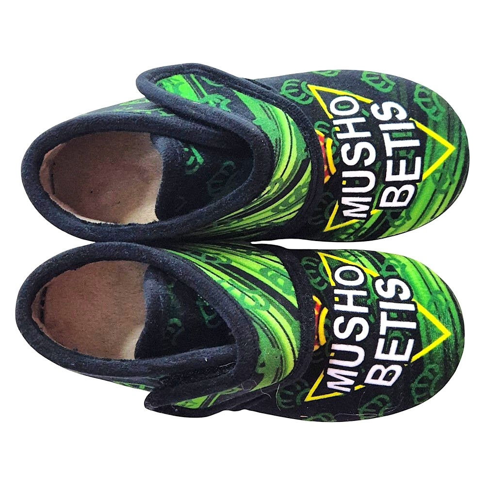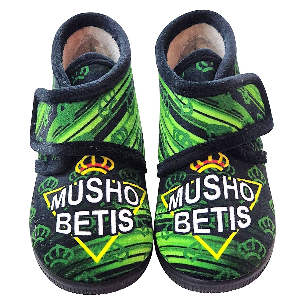 El diseño incorpora el lema "MUSHO BETIS" con el escudo coronado y los colores icónicos de la equipación. Este artículo es un producto fabricado en España, garantizando durabilidad y acabados de primera calidad para el aficionado. Ideales para cualquier miembro de la familia que comparta la pasión por el Betis.