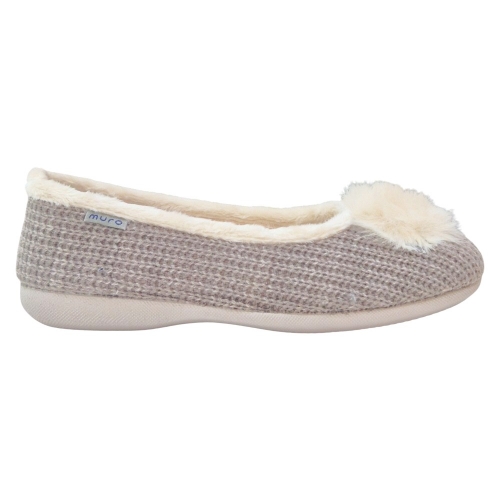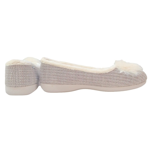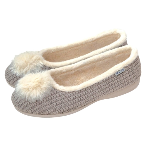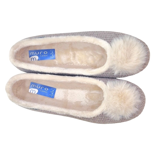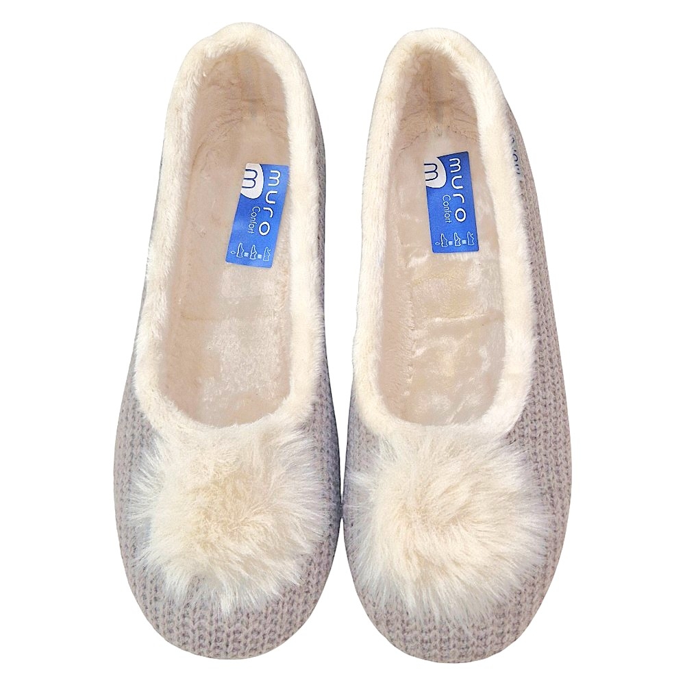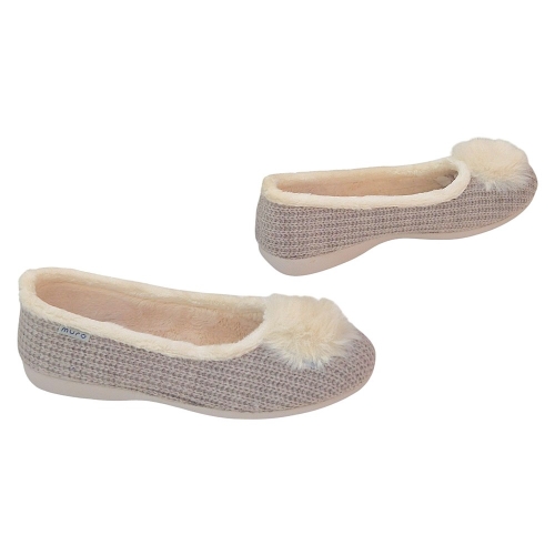 Fabricadas con un tejido exterior de punto en tono arena, estas zapatillas presentan un diseño tipo bailarina, elegantemente adornado con un coqueto pompón de pelo sintético en la parte delantera. Su interior está completamente forrado con un material de pelo sintético muy suave y cálido, ideal para mantener tus pies confortables durante todo el día, especialmente en los meses más fríos.