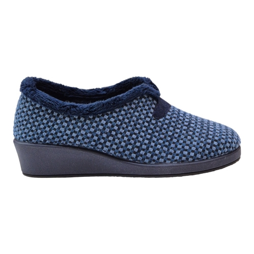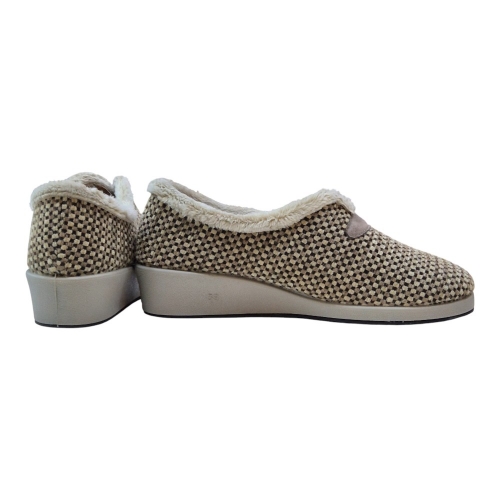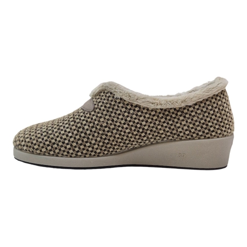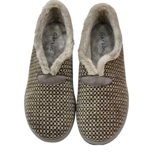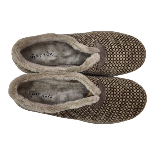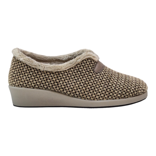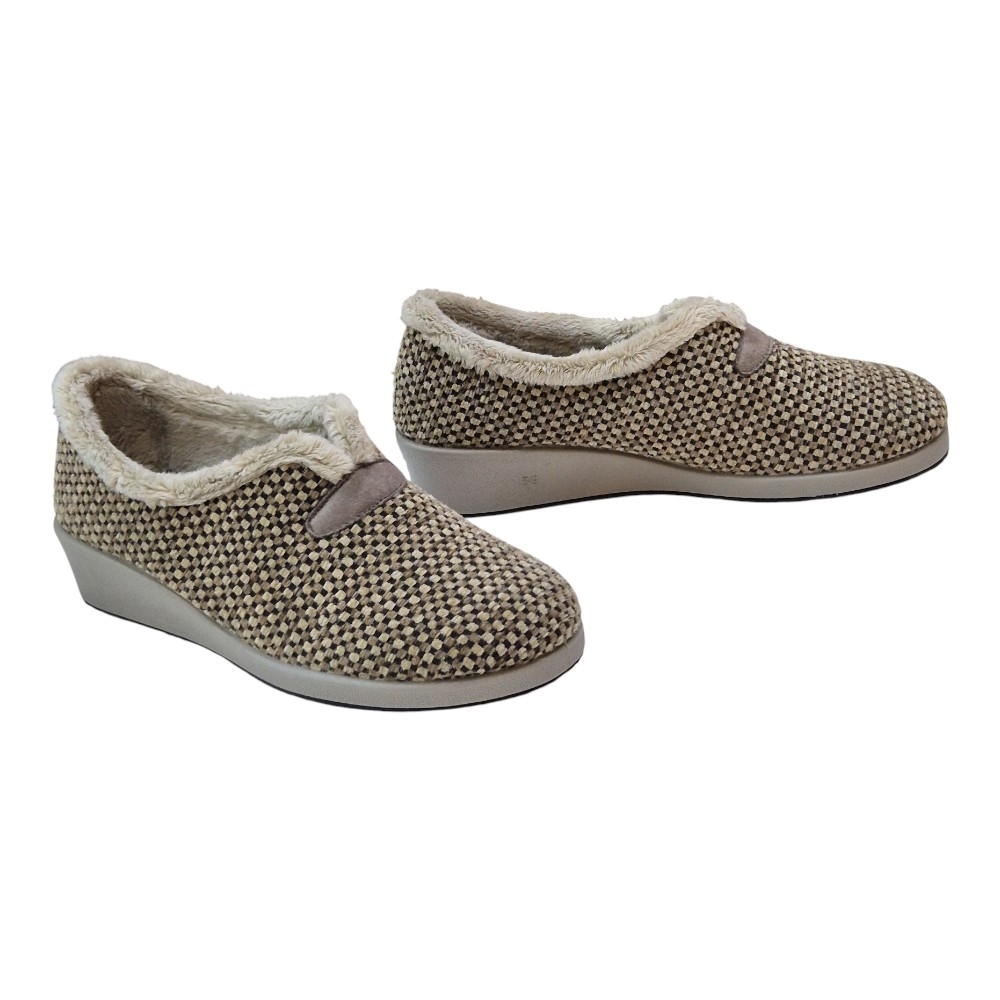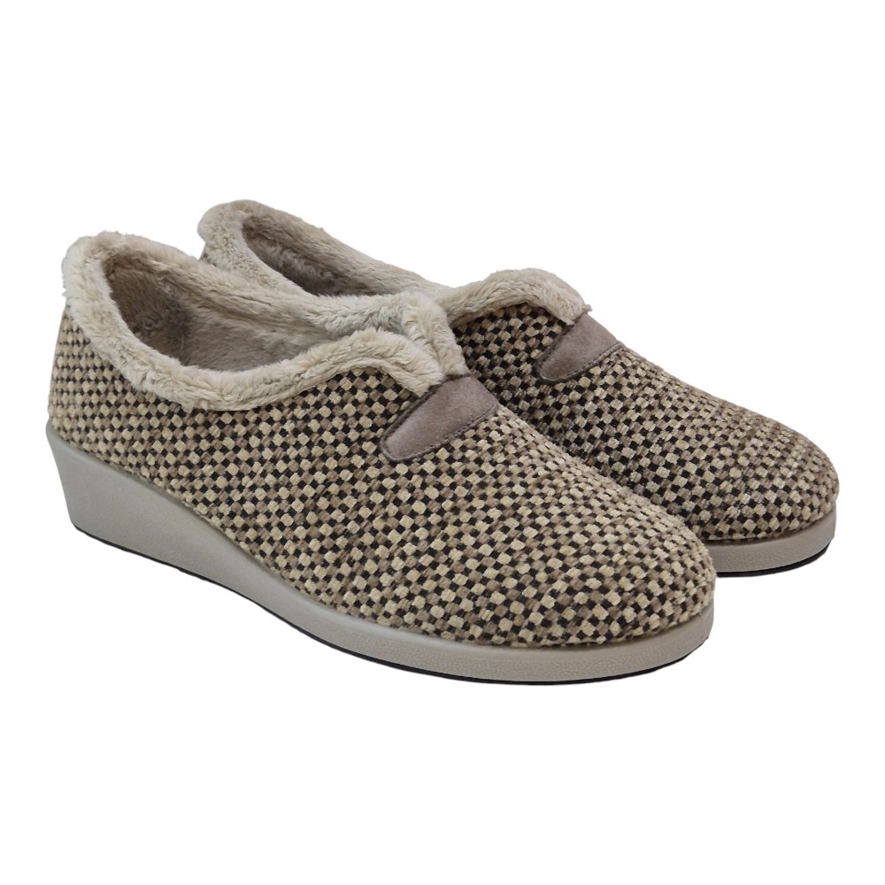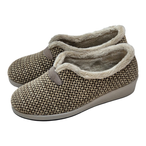 Su acabado en color Berta Taupe destaca por un elegante patrón de micro-cuadros en tonos neutros, aportando un toque sofisticado y atemporal a tu calzado de descanso.
