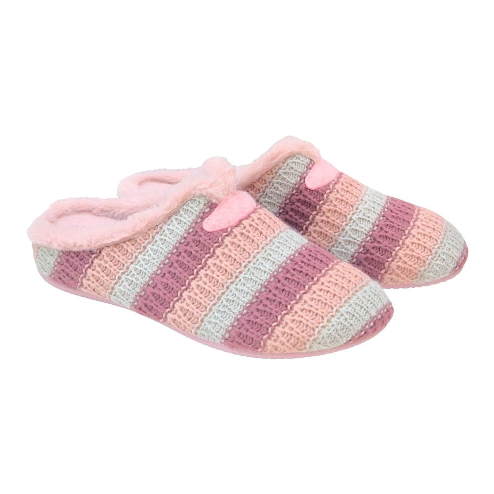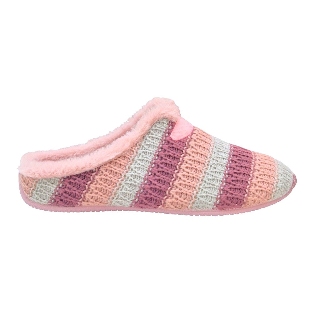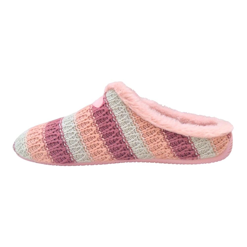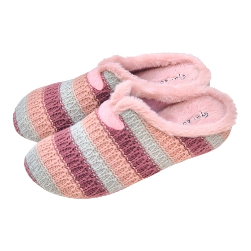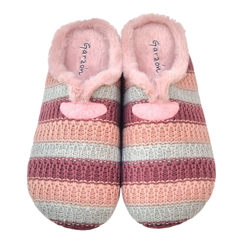 Este modelo destaca por su acabado en lana trenzada de alta calidad, presentando un elegante patrón de rayas horizontales en una armoniosa paleta de tonos malva, rosa palo y gris perla. Su diseño tipo "zueco" abierto por el talón permite ponerlas y quitarlas con total facilidad, mientras que el detalle de la pieza de fieltro en el empeine le otorga un toque distintivo y artesanal.